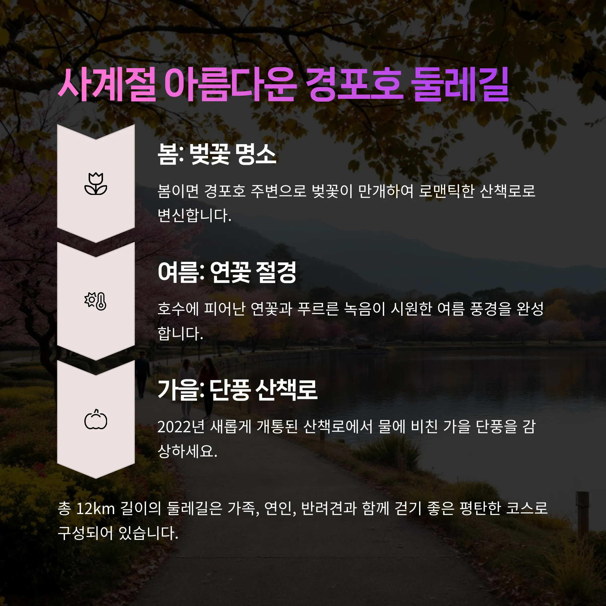 | 추천 활동 | 산책, 바다 구경 | 소나무 숲 산책 |