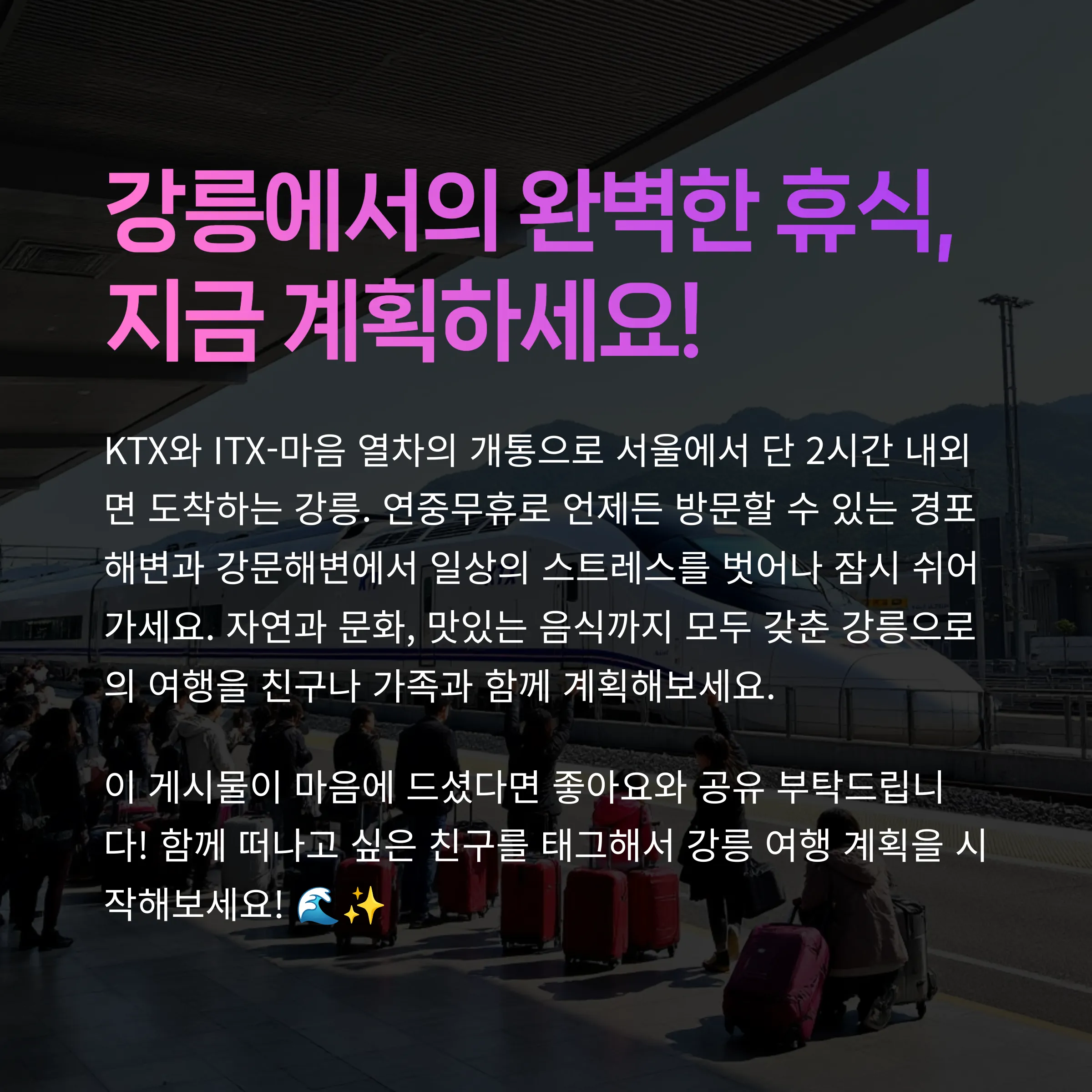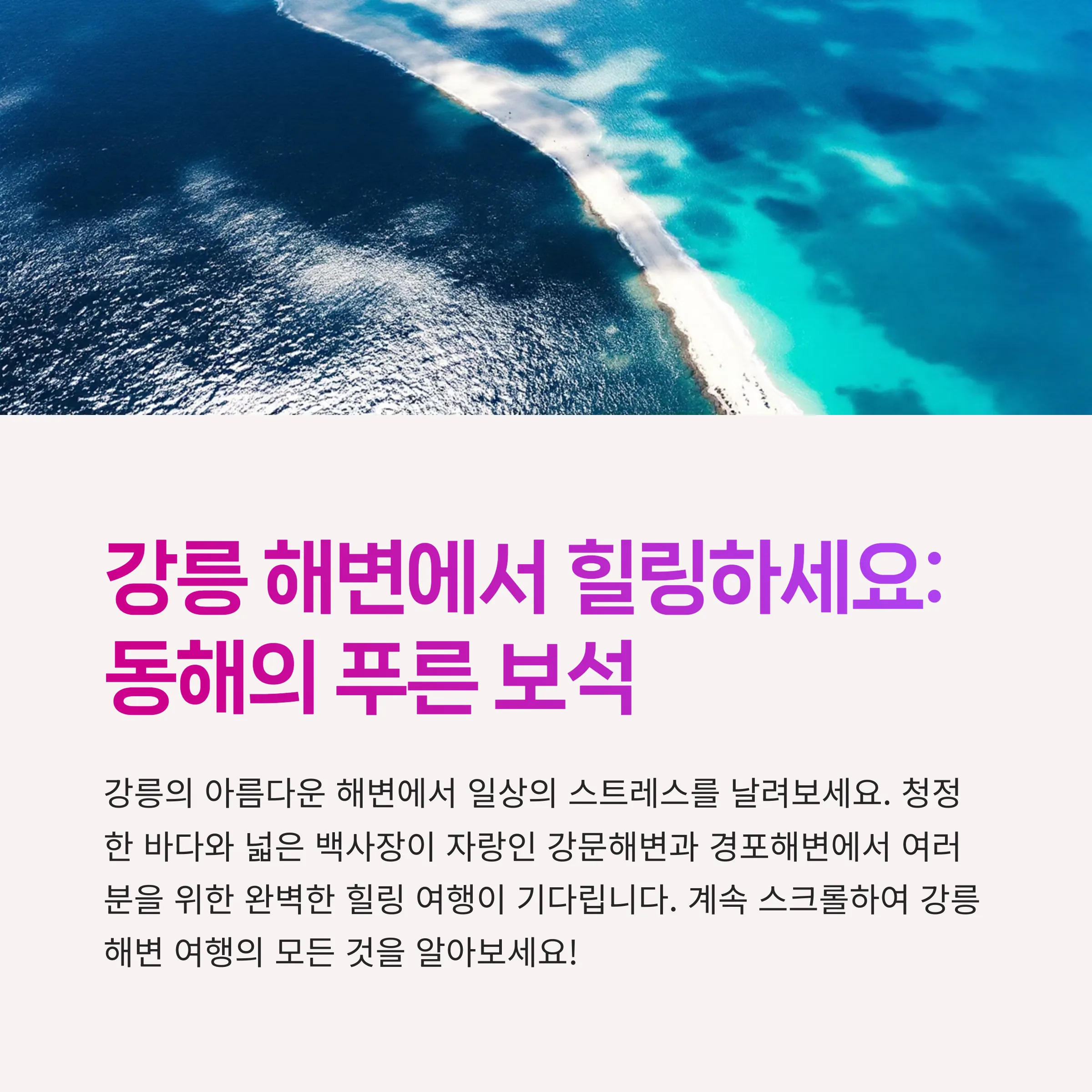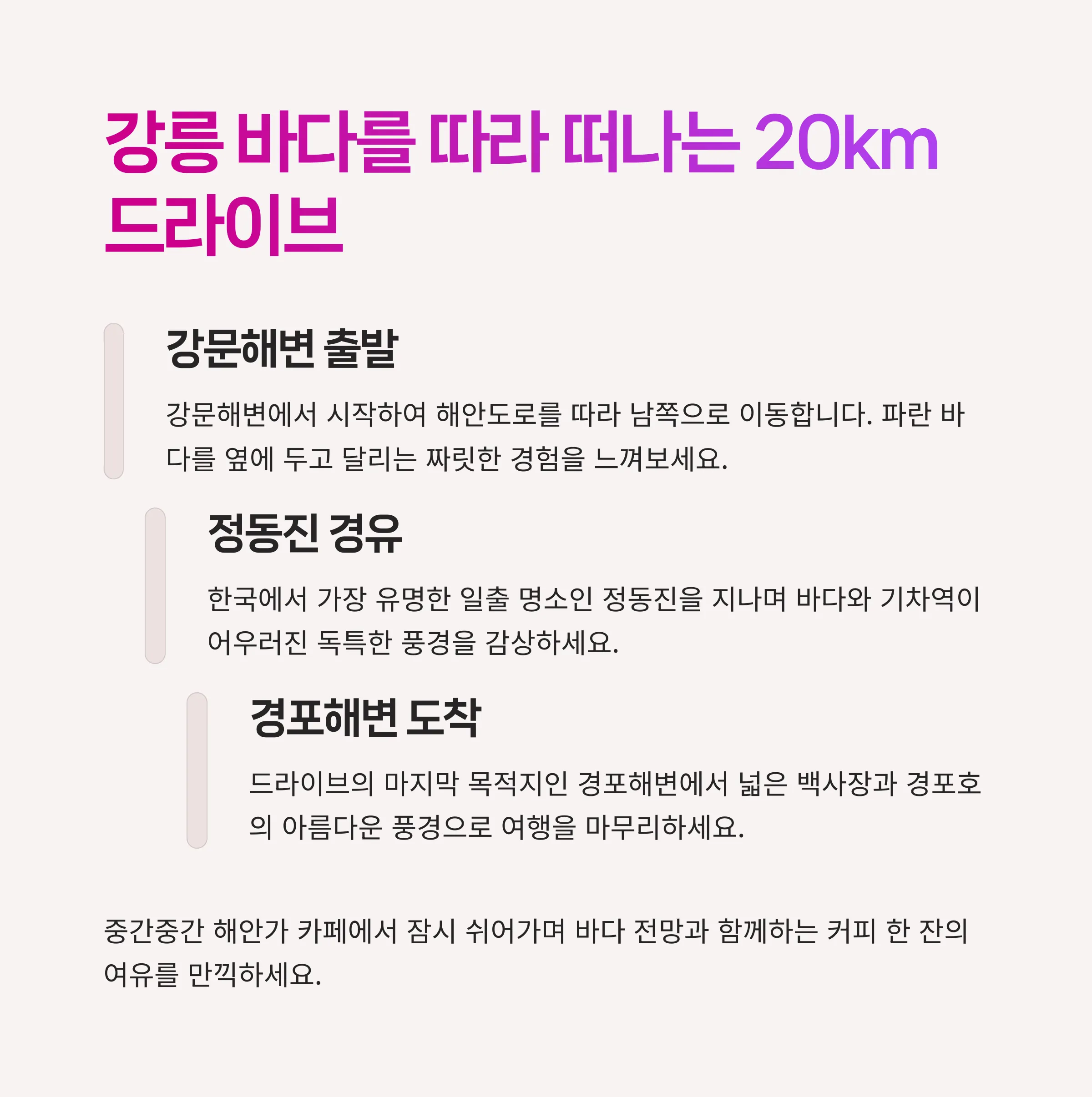 강릉 해안의 드라이브를 떠나면서, 잠시 멈춰 경치를 감상하거나 산책을 즐겨보세요.