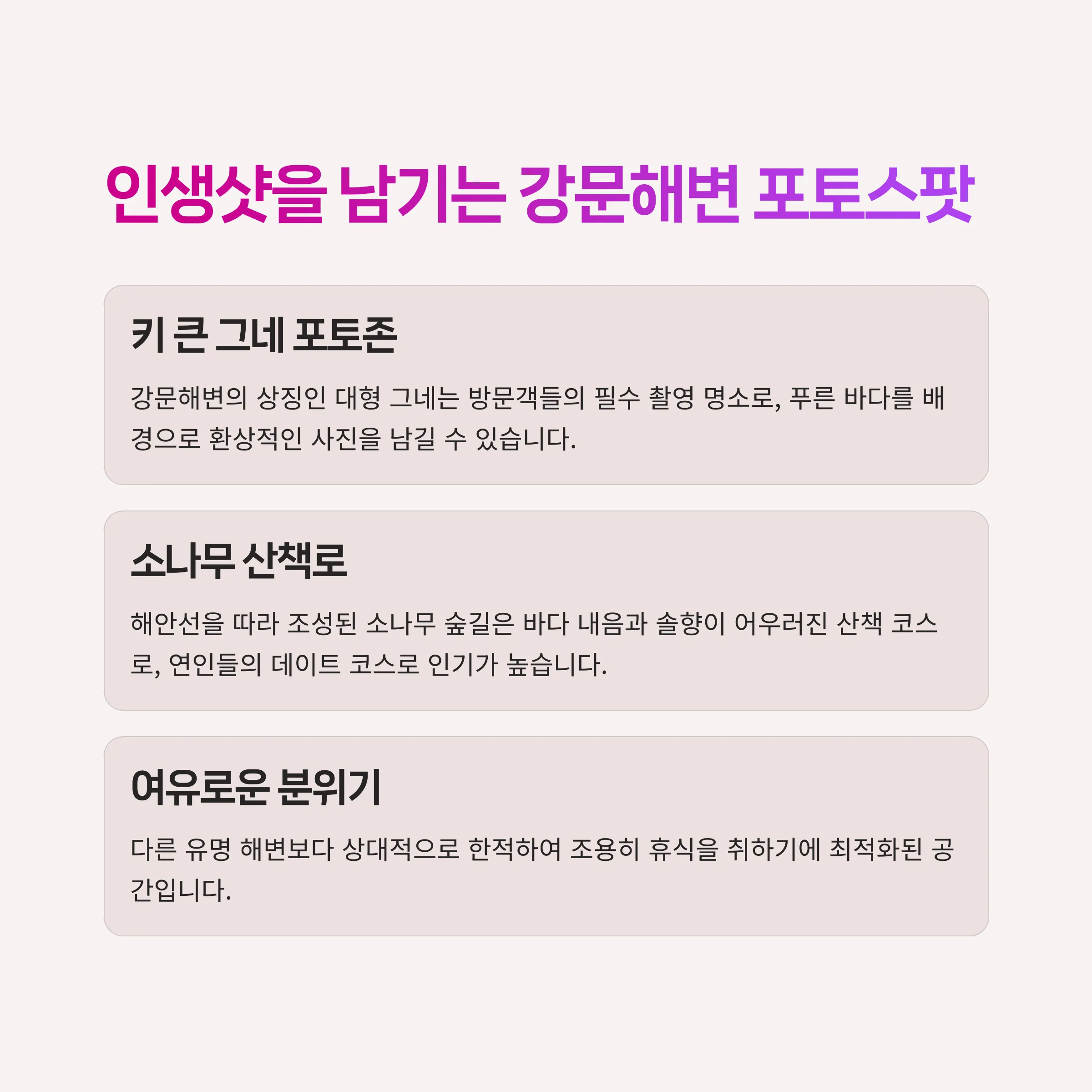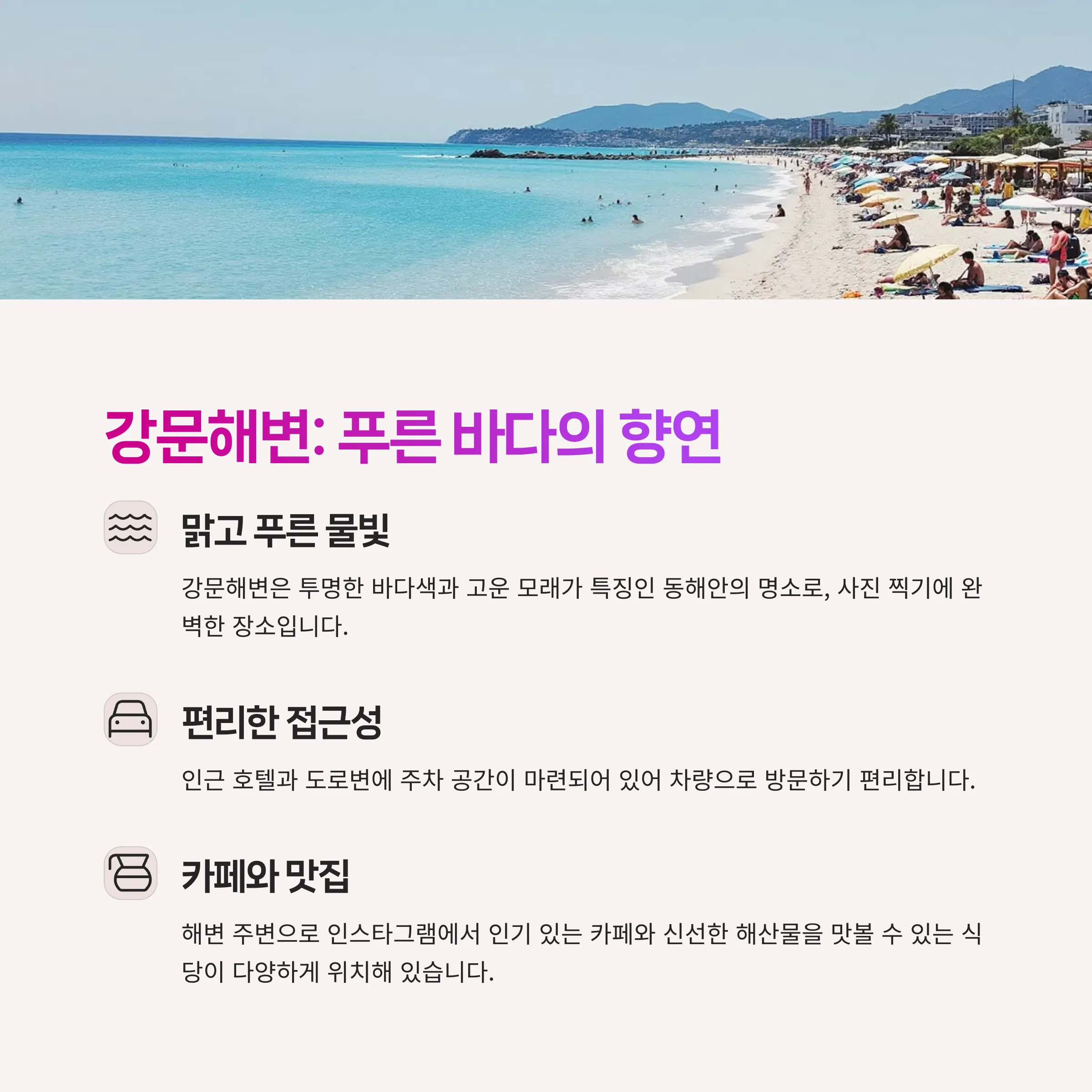 강문해변은 주변의 맛집과 부드러운 해변 질감으로 보다 휴가스러운 분위기를 제공합니다. 경포해변은 호수를 중심으로 하이킹이나 자전거 코스로도 충분히 매력적입니다.