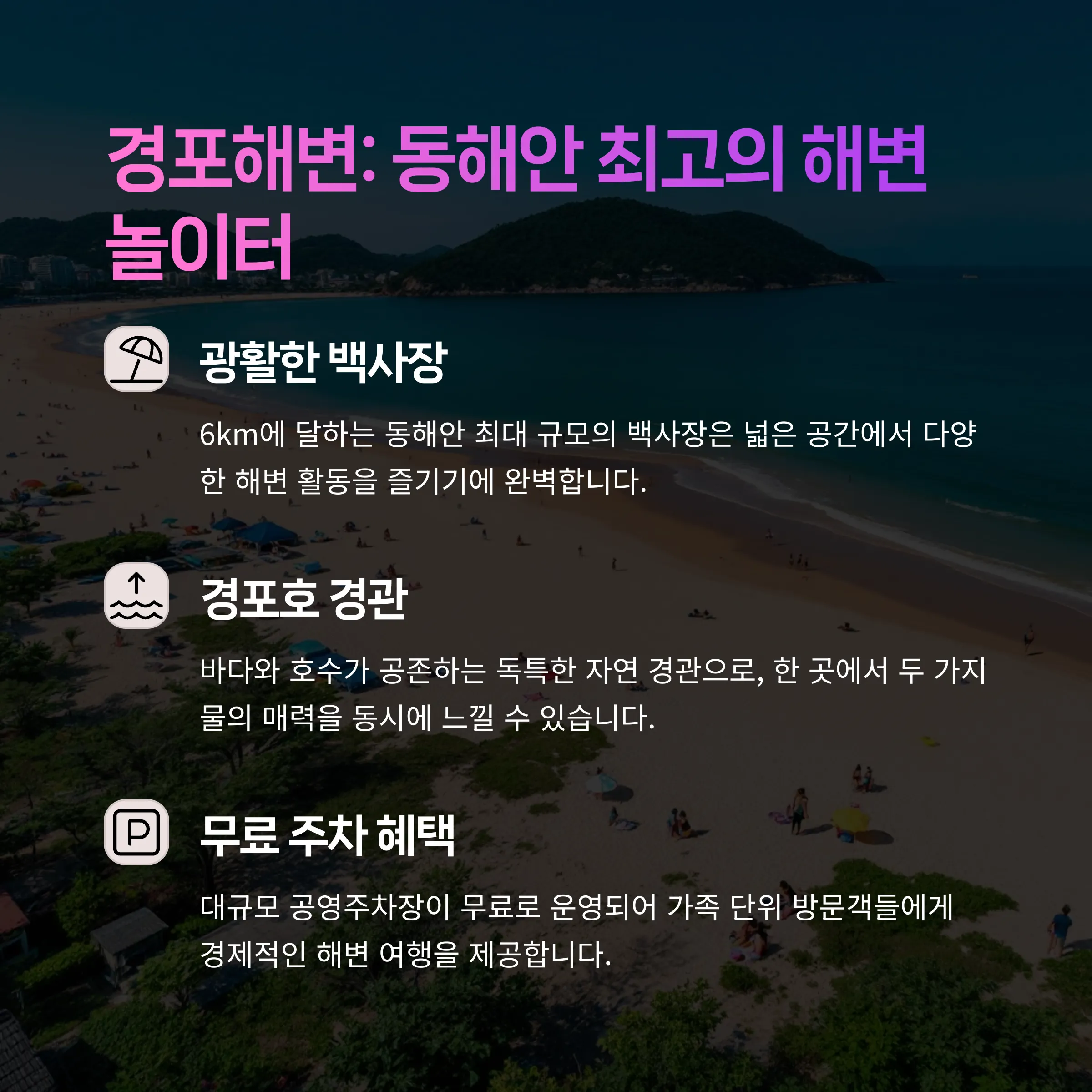 반면 경포해변은 6km의 긴 백사장과 함께 소나무 숲의 차분한 분위기가 특징입니다. 특히 경포호를 둘러싼 자연경관은 마치 시간이 멈춘 듯한 새로운 매력을 느끼게 합니다.