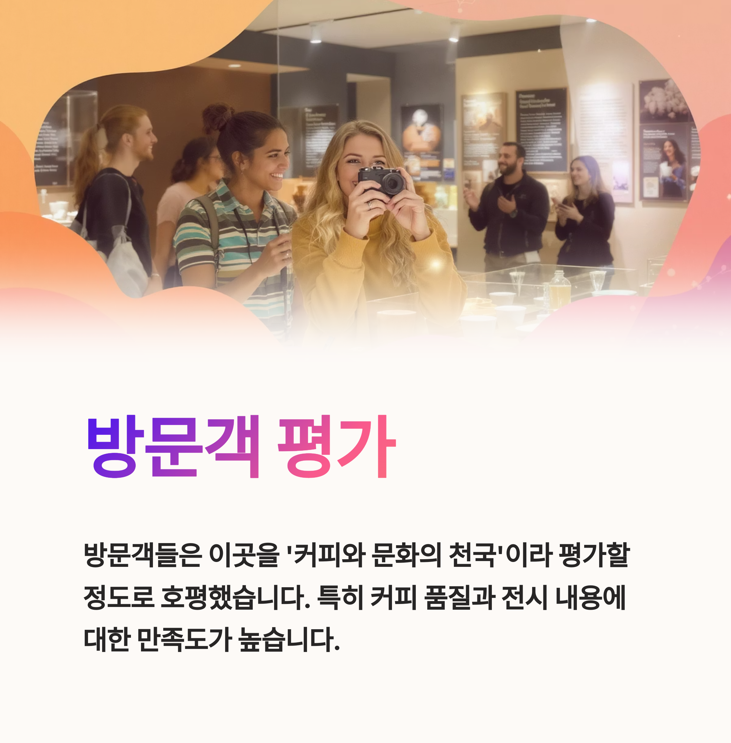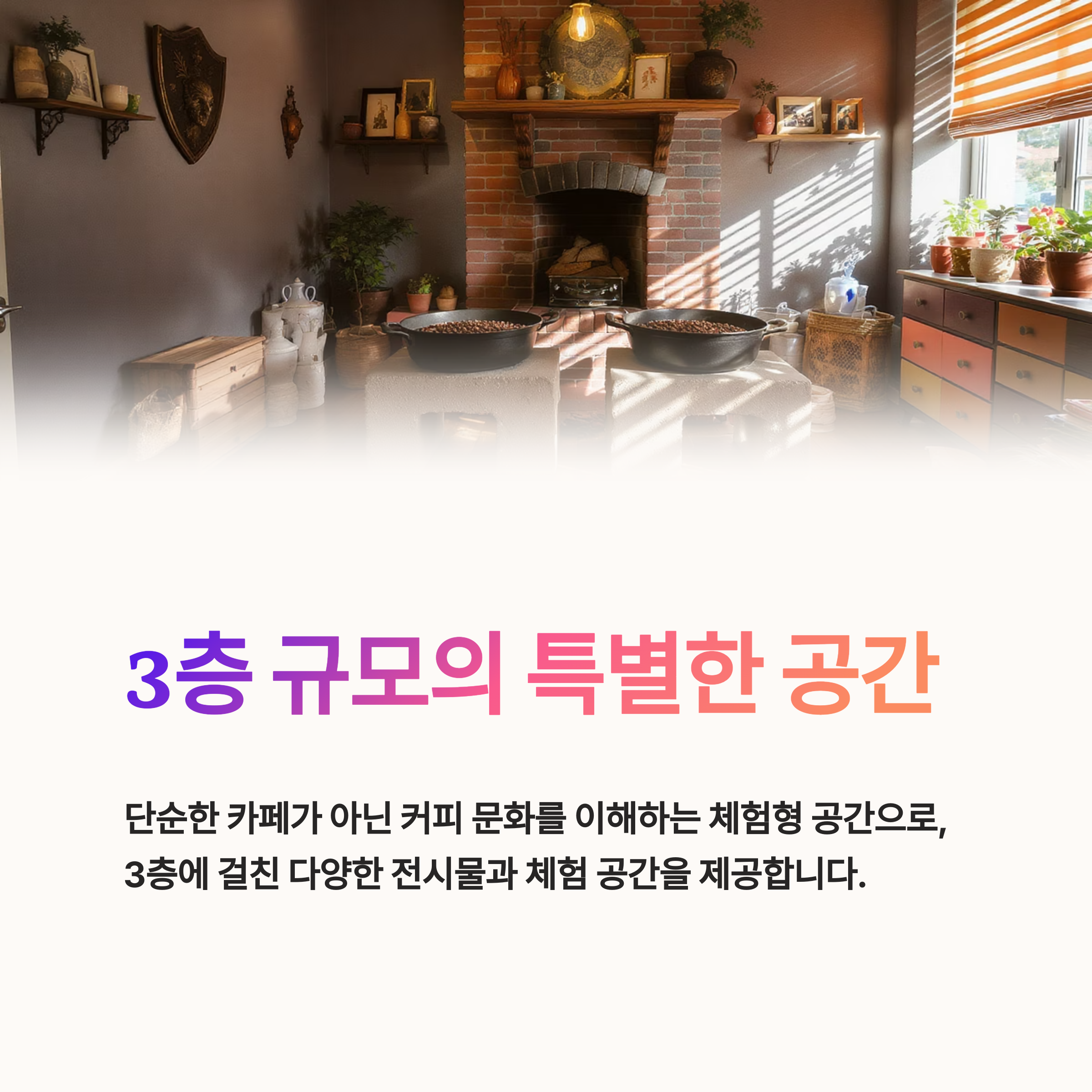 첫째, 커피와 문화를 동시에 즐길 수 있는 독특한 공간으로, 단순 카페가 아닌 박물관과 3층에 걸친 다양한 전시물과 체험 공간을 제공합니다.