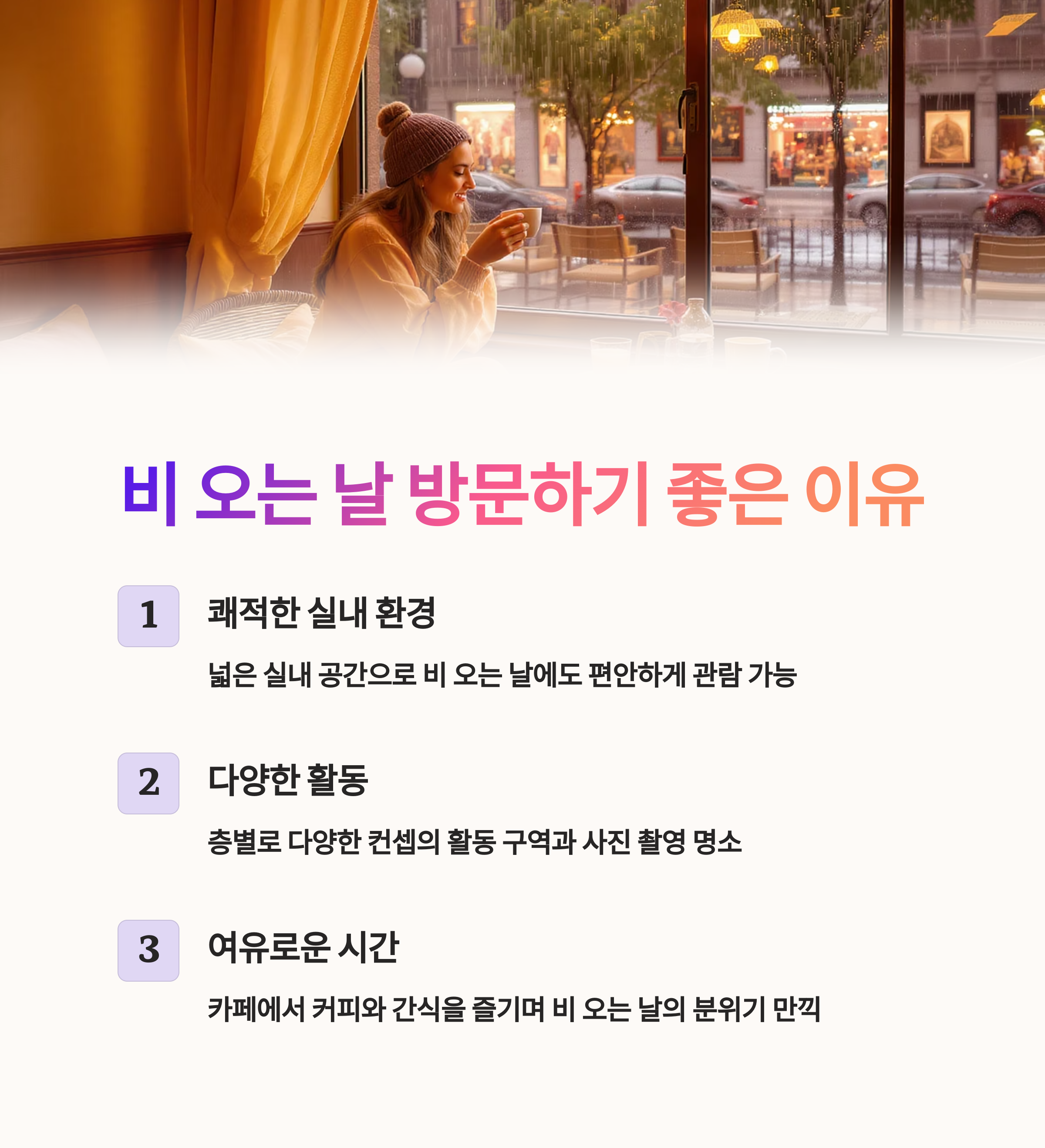 특히 비 오는 날의 특별한 실내 데이트 장소로 최적이며, 커피를 좋아하는 이들에게도 큰 만족감을 줍니다.