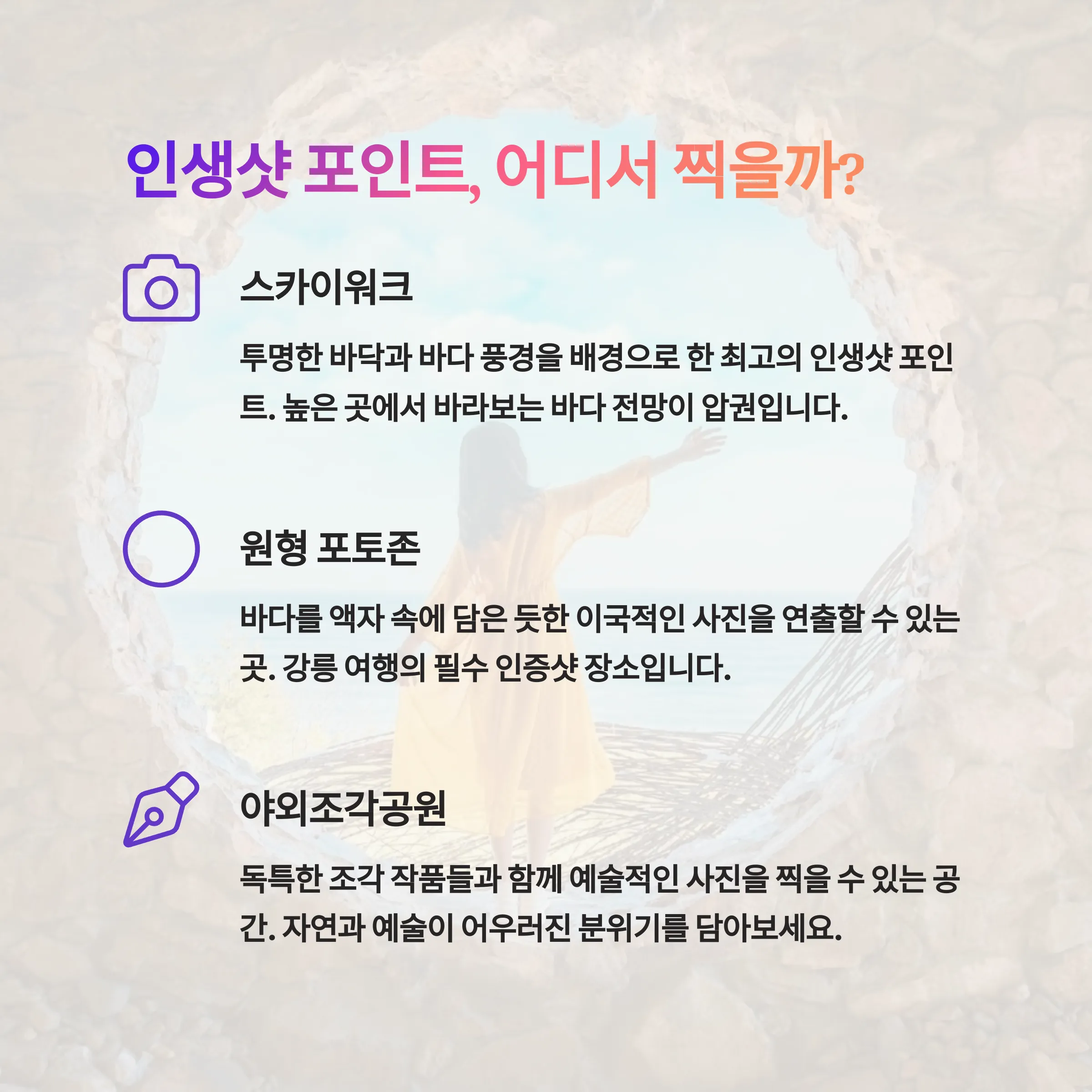특히, 바다를 배경으로 한 원형 포토존은 사진 찍기 좋은 포인트로 유명합니다.