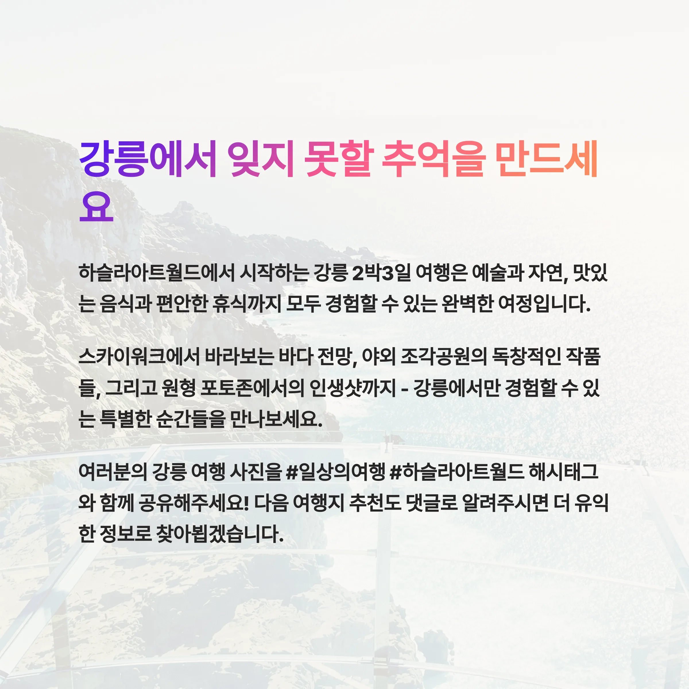 강릉은 다채로운 관광 명소와 맛집으로 가득해, 하슬라아트월드와 함께 2박3일 여행 코스를 계획하기에 이상적입니다.