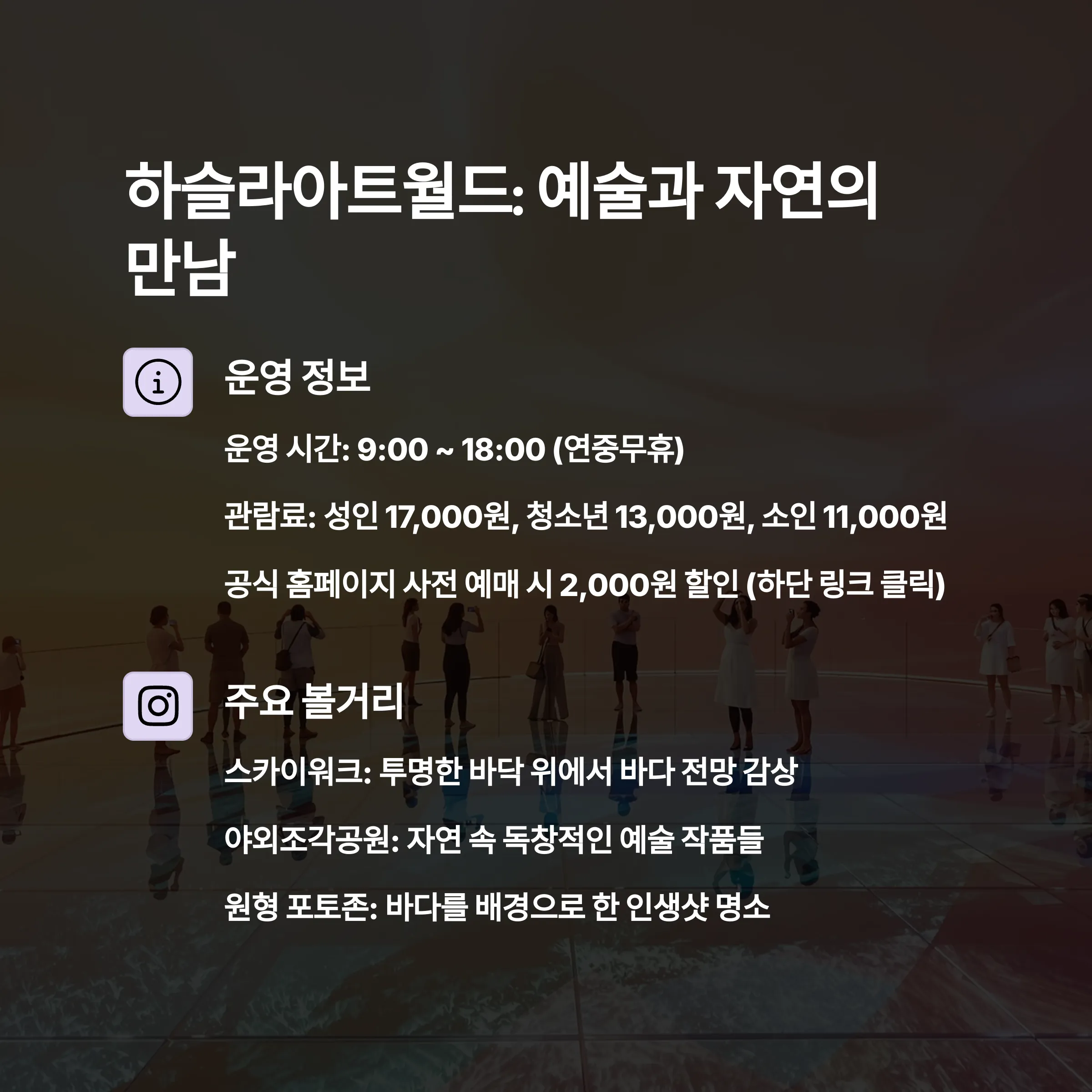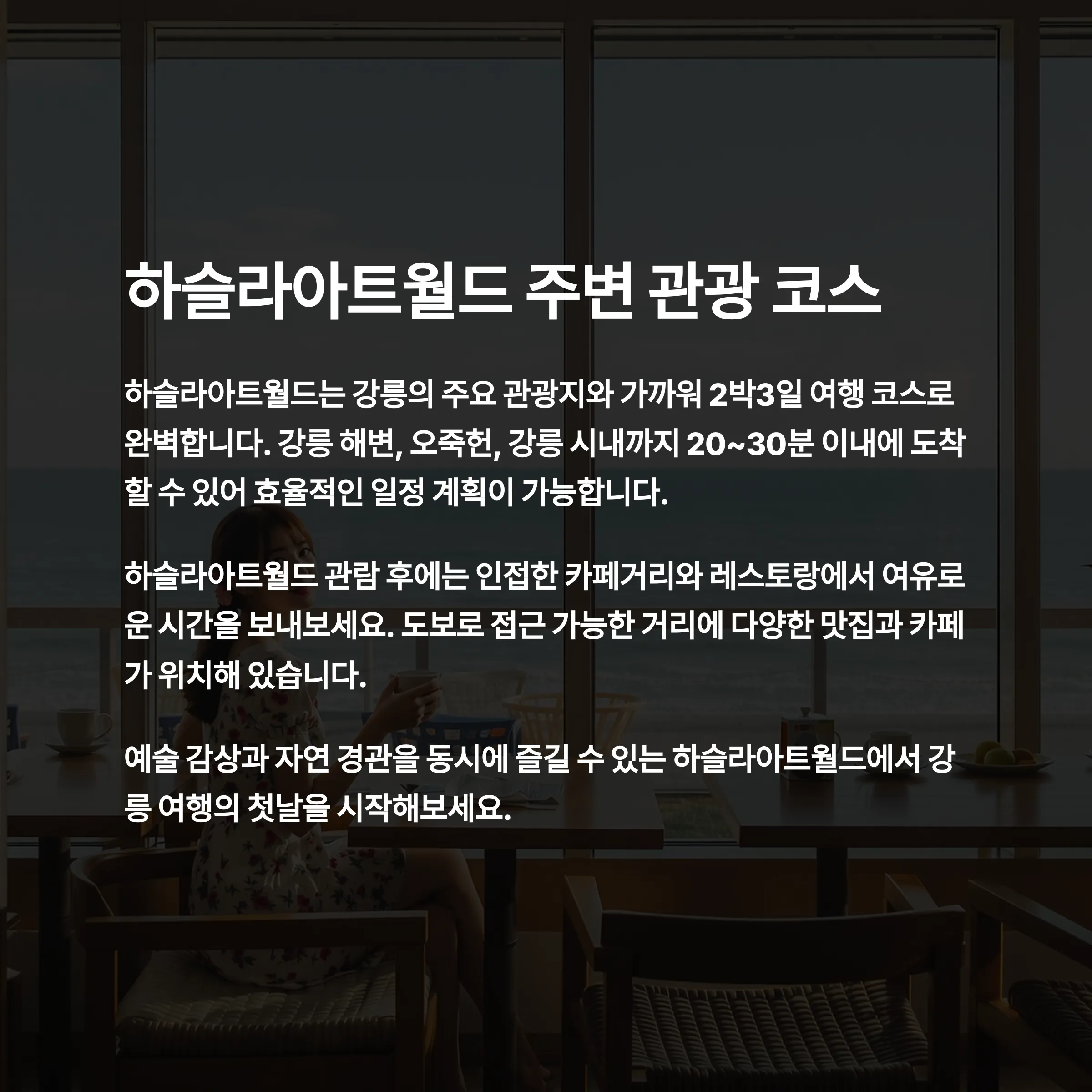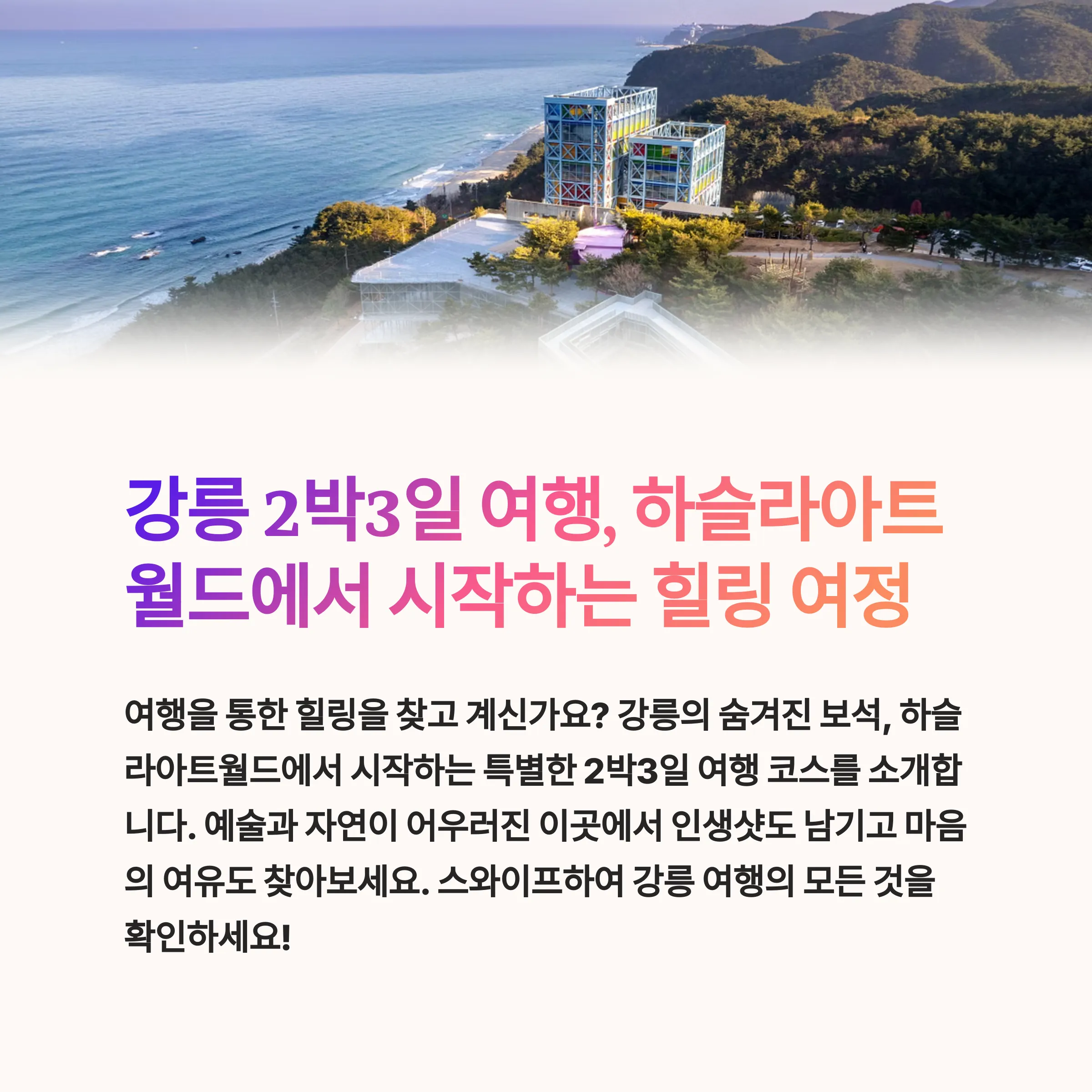 이번 강릉 여행에서 하슬라아트월드에서의 시간을 시작으로, 잊지 못할 하루를 완성해 보세요.