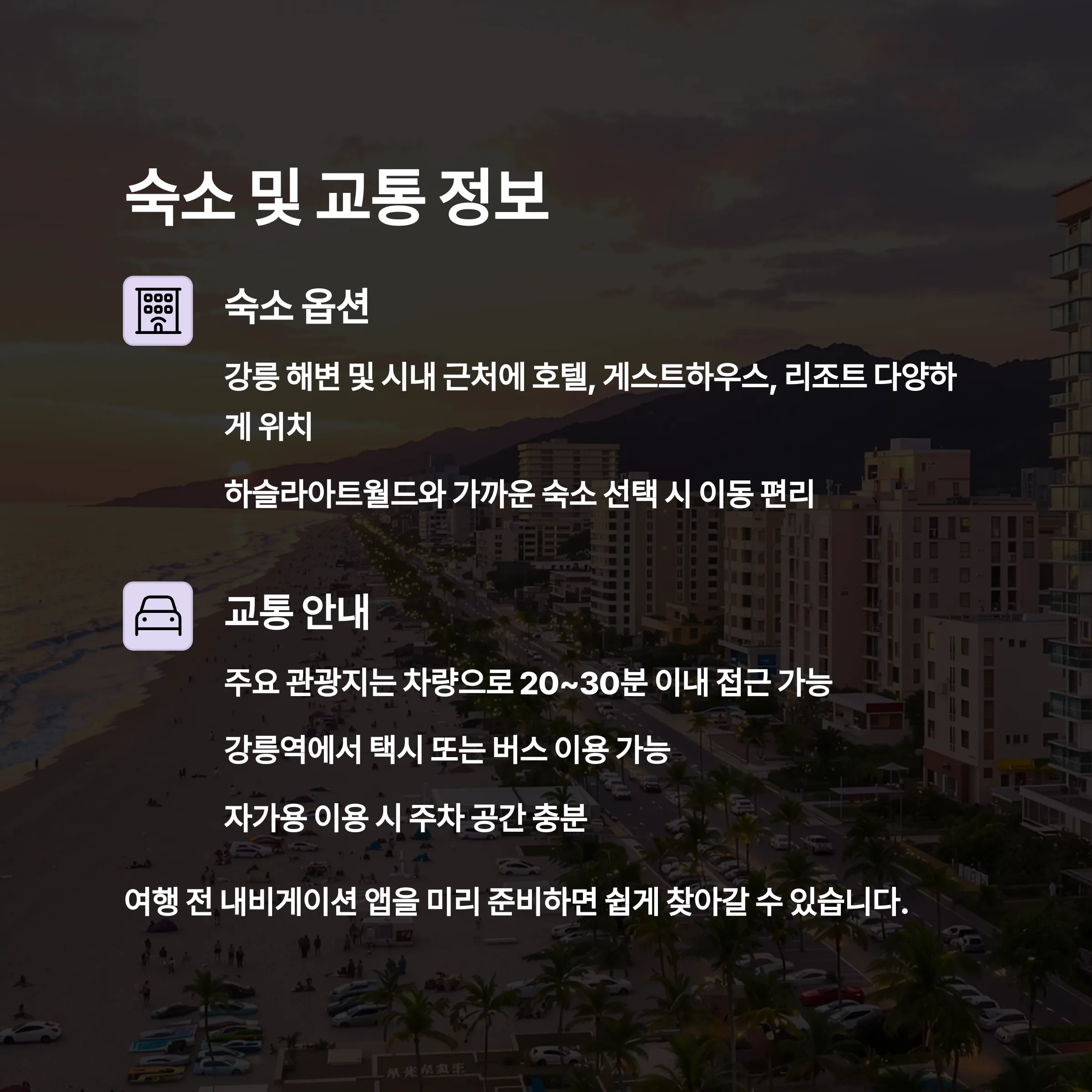 | 주요 숙소 위치 | 강릉 해변 및 시내 근처 |
