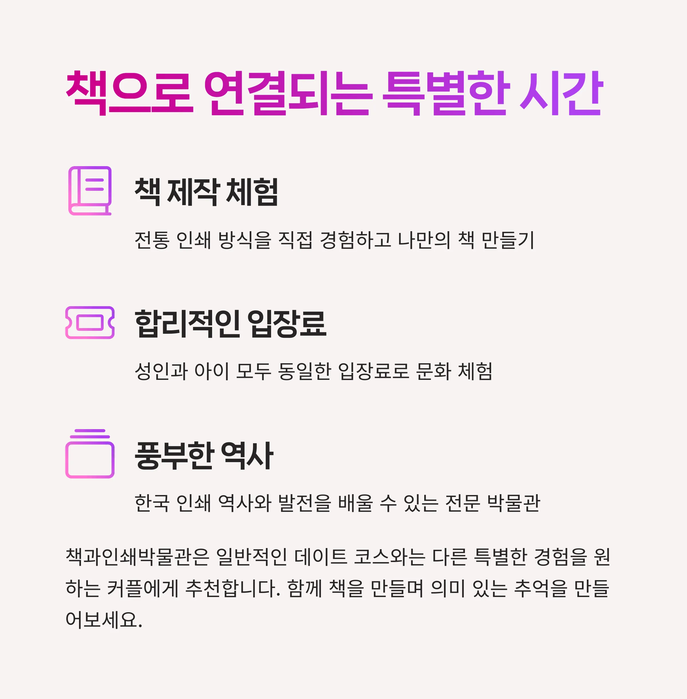 여러분은 이곳에서 책 제작의 역사와 문화를 체험하며 특별한 시간을 가질 수 있습니다.