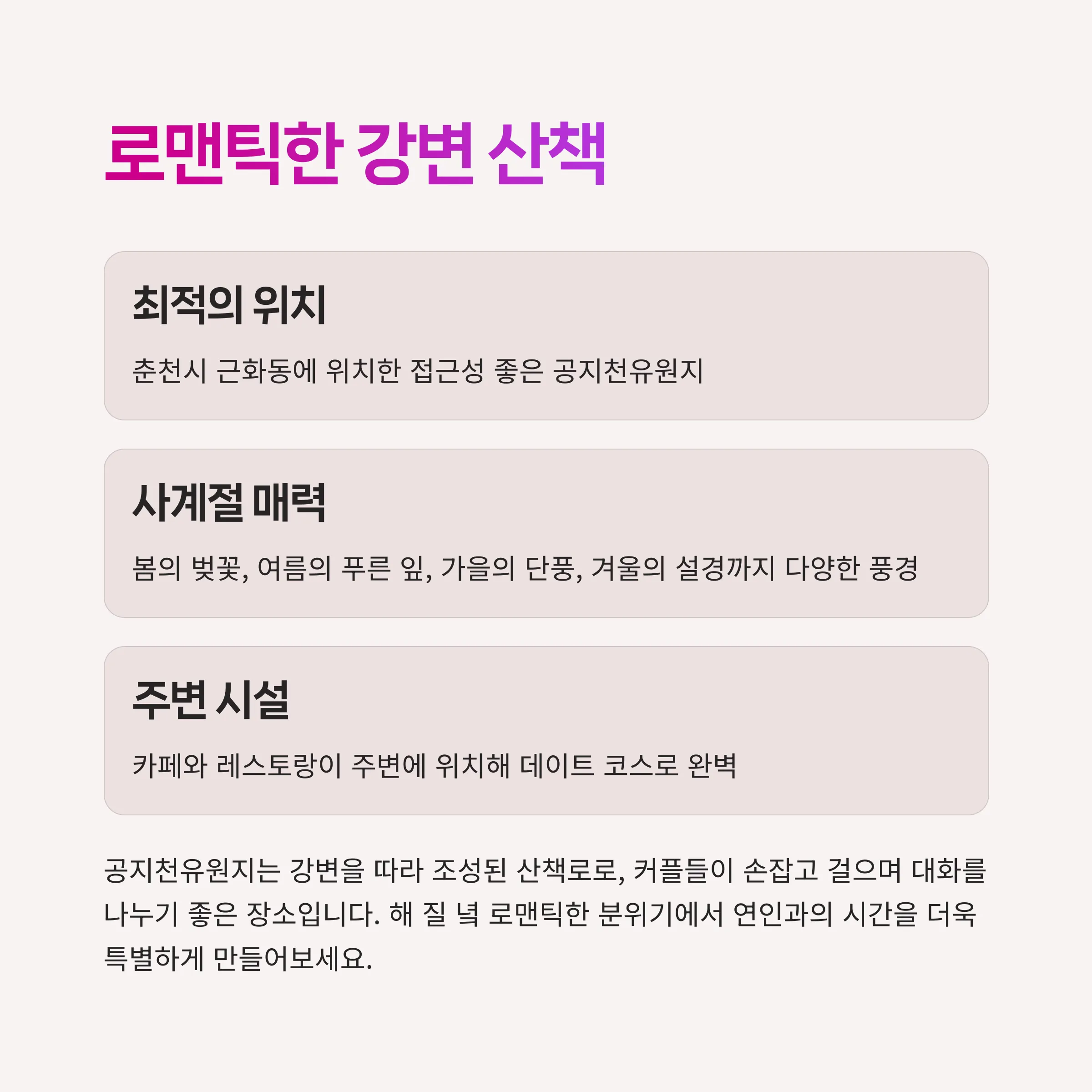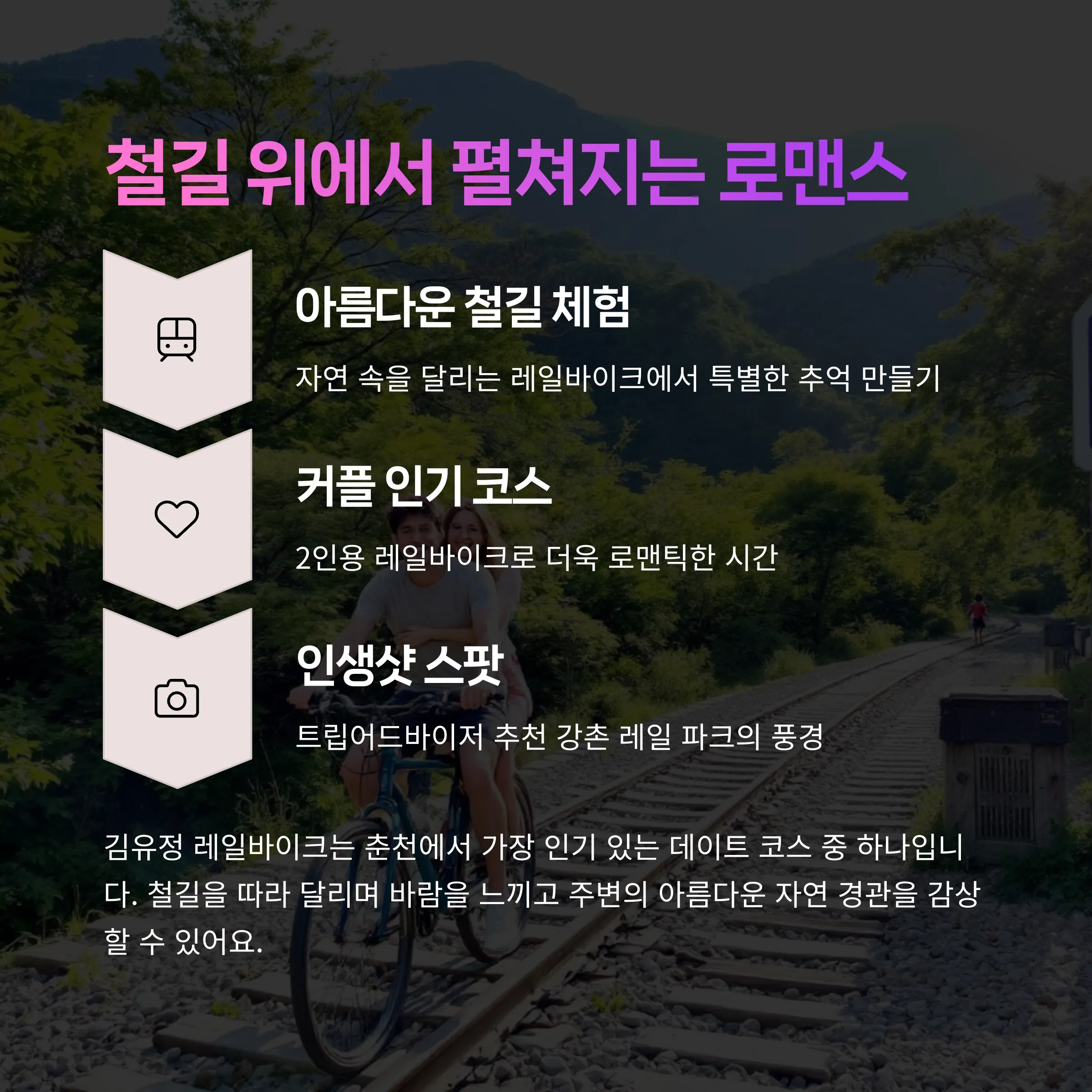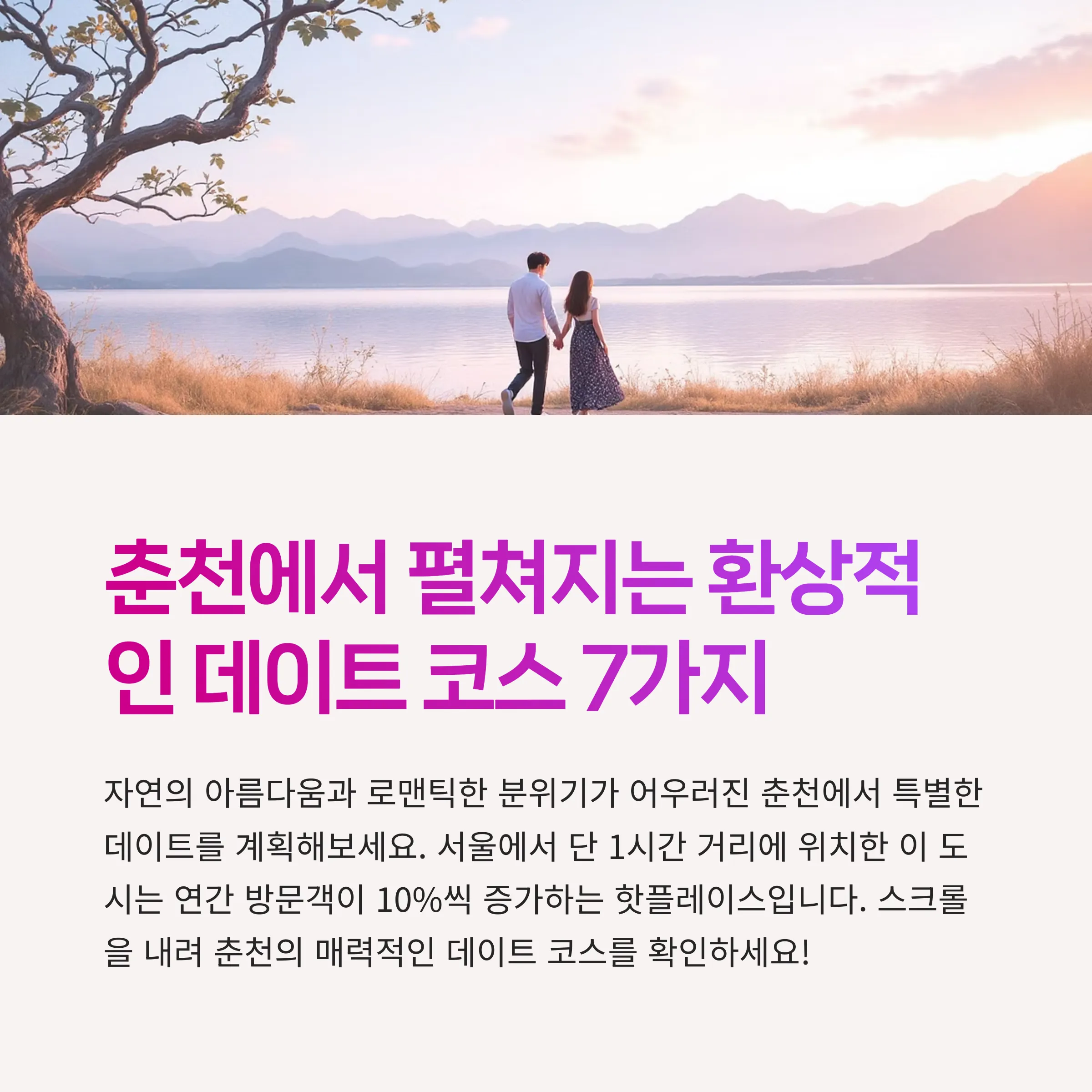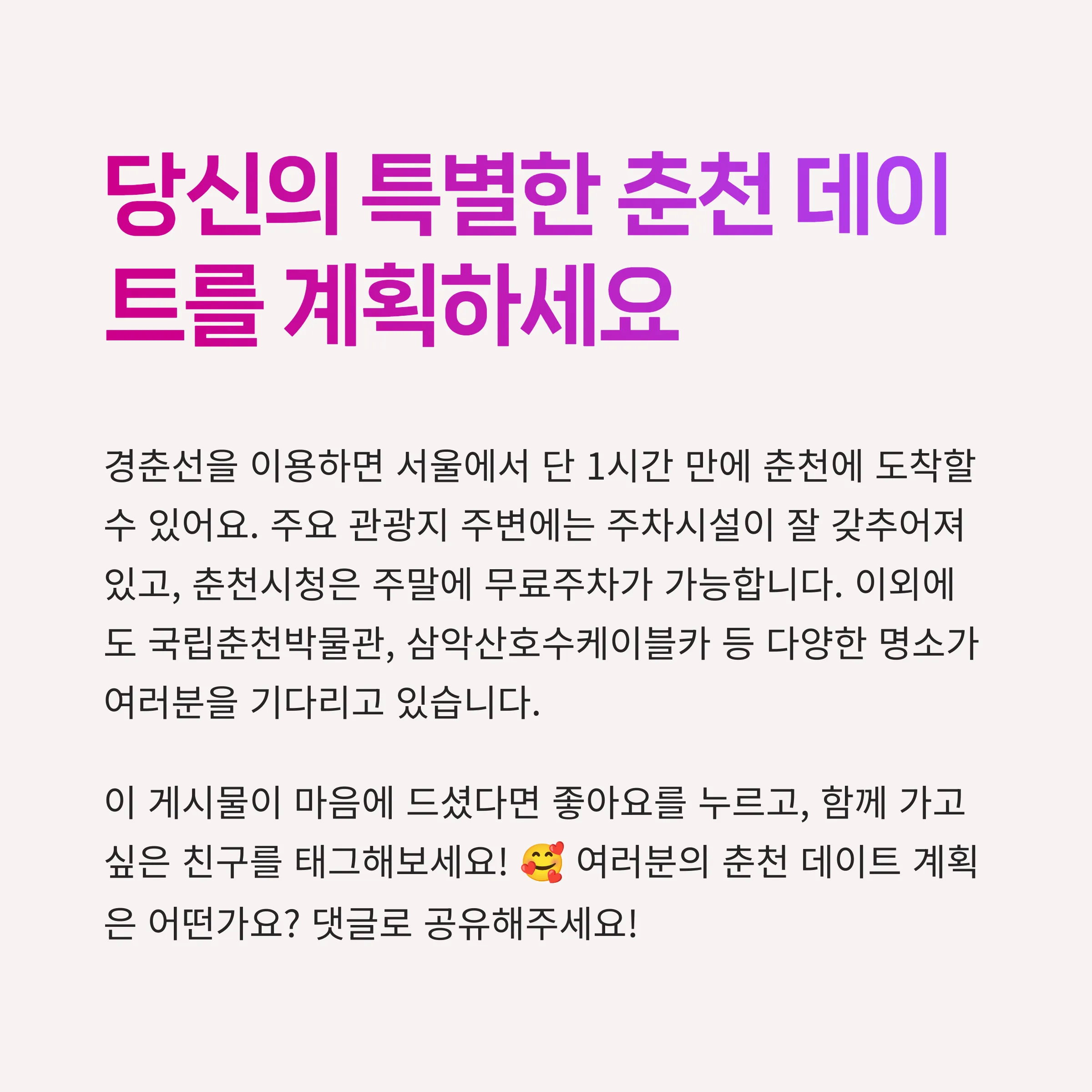 이번 기회를 통해 춘천의 다양한 데이트 코스와 명소를 탐방하며 소중한 시간을 보내시길 바랍니다.