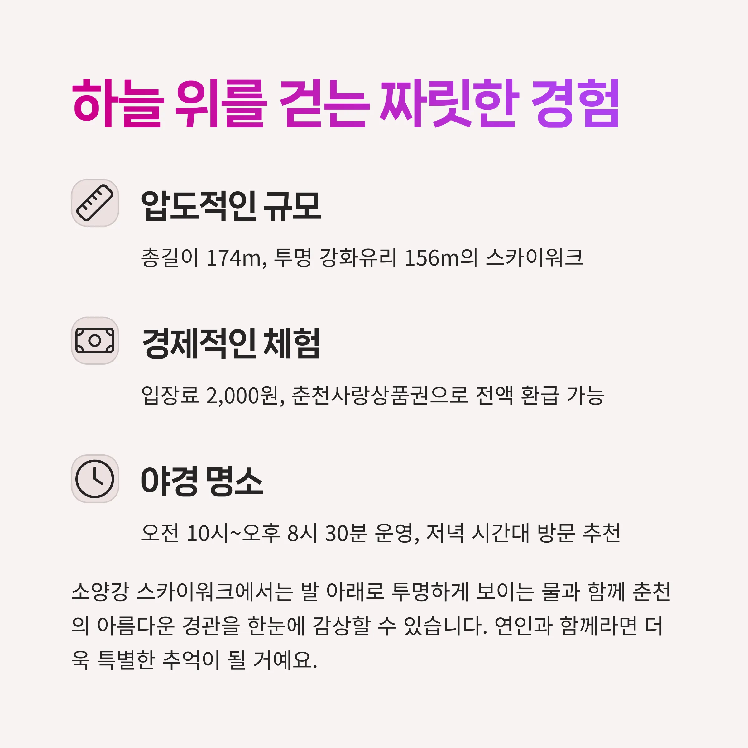 | 소양강 스카이워크 | 강원도 춘천시 영서로 2663 | 상시 운영 | 웅장한 강뷰 체험 |