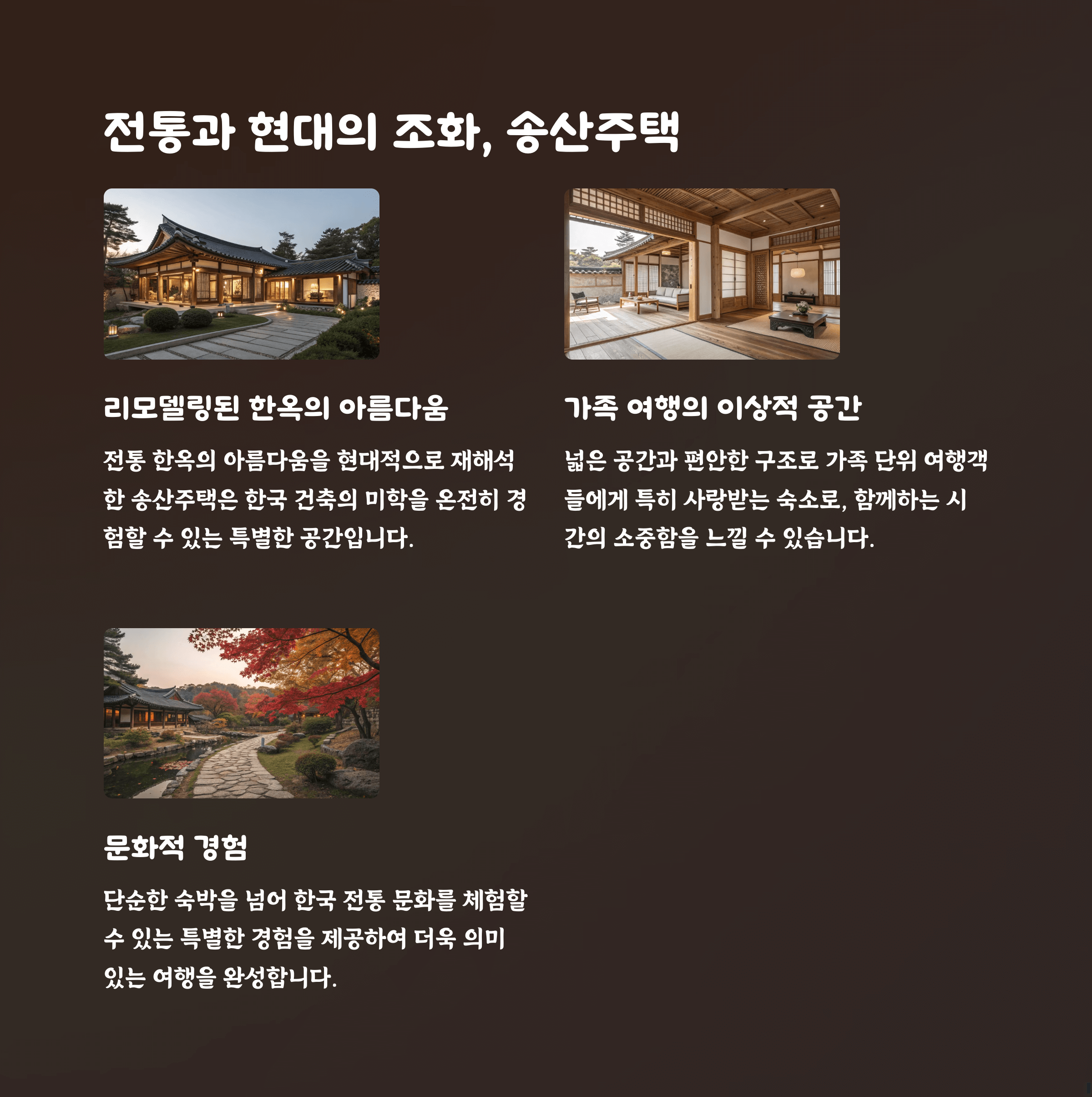 만약 전통미와 한옥 스타일을 선호한다면, 송산주택과 같은 리모델링된 한옥 숙소를 추천합니다.