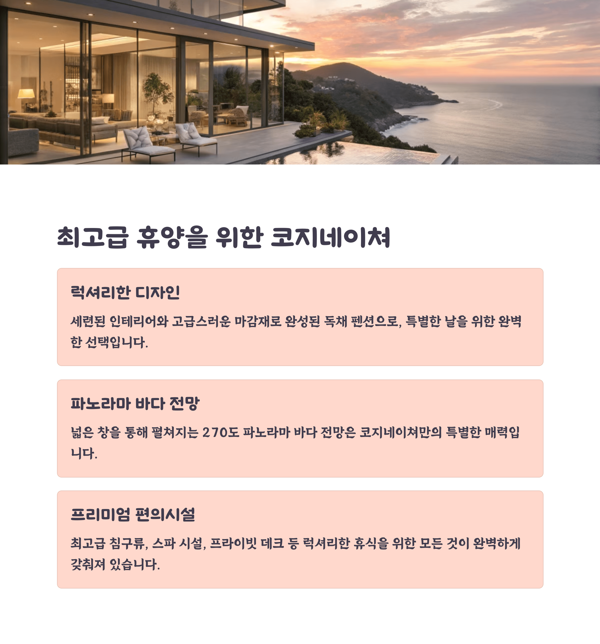 바다와 가까운 오션뷰 숙소들은 낙조를 즐길 수 있는 멋진 경관을 제공합니다.