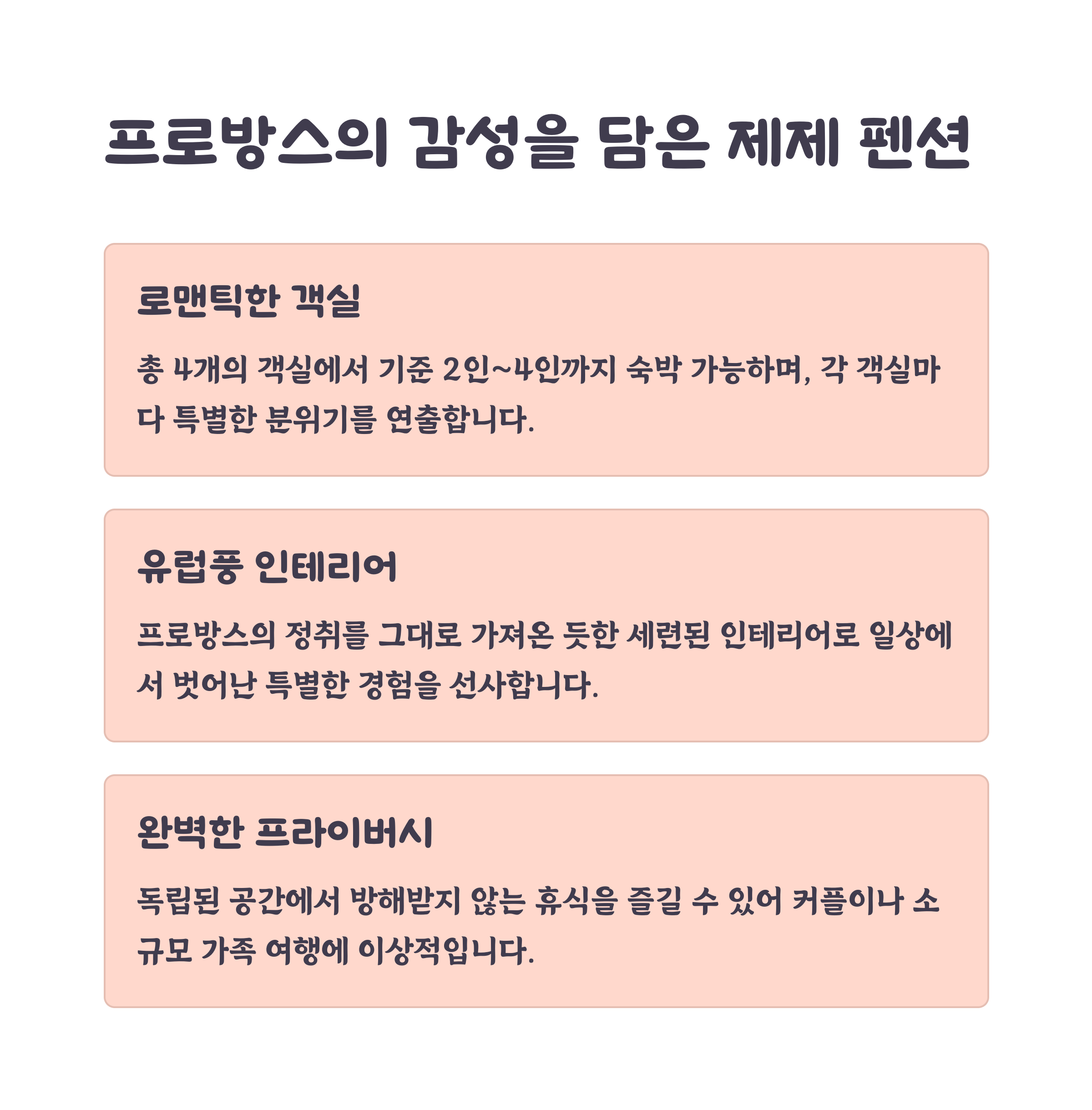 각 펜션의 테마와 독특한 매력을 확인해 개인의 취향에 맞게 선택하세요.