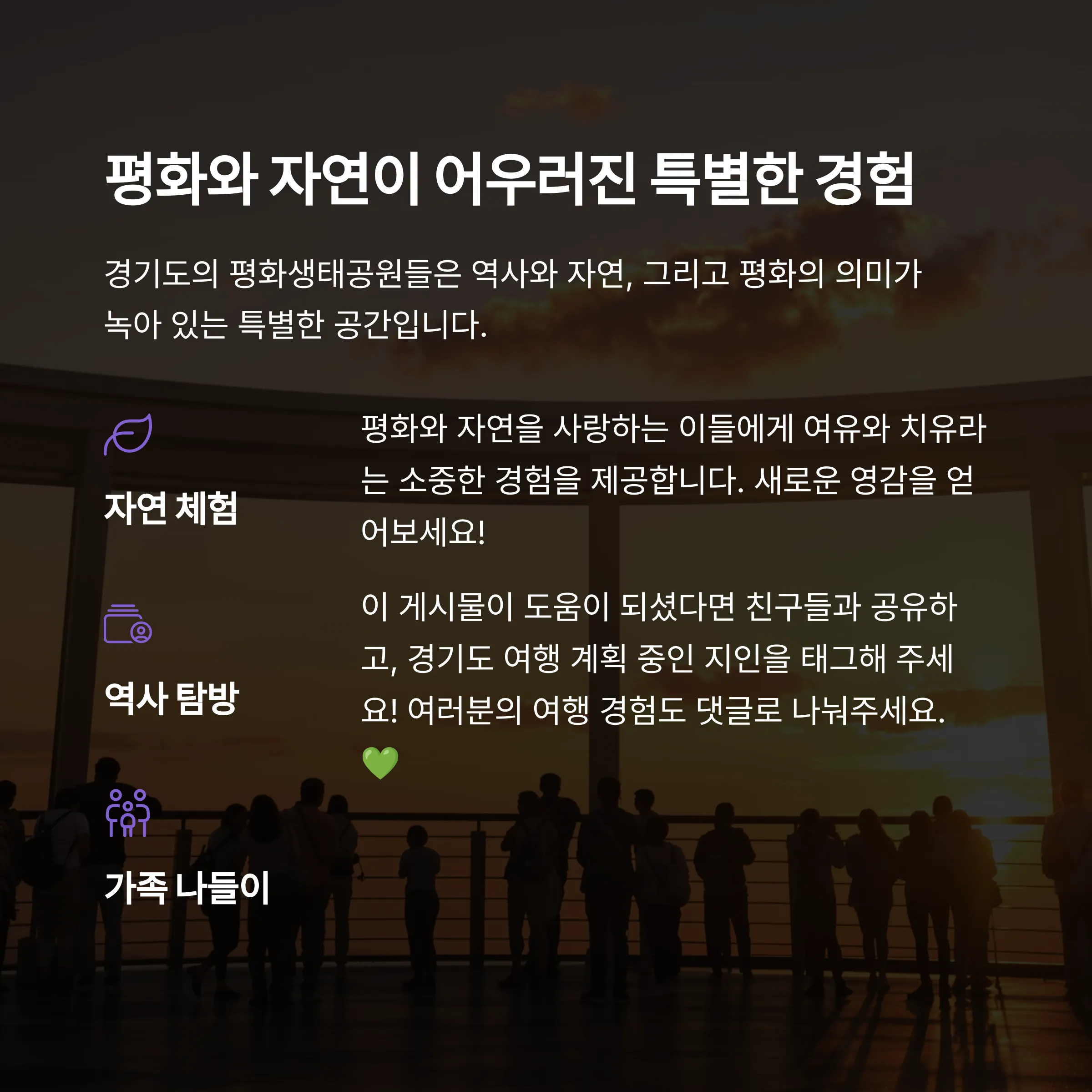 이러한 경기도의 평화생태공원들은 평화와 자연을 사랑하는 이들에게 여유와 치유라는 소중한 경험을 제공합니다.
