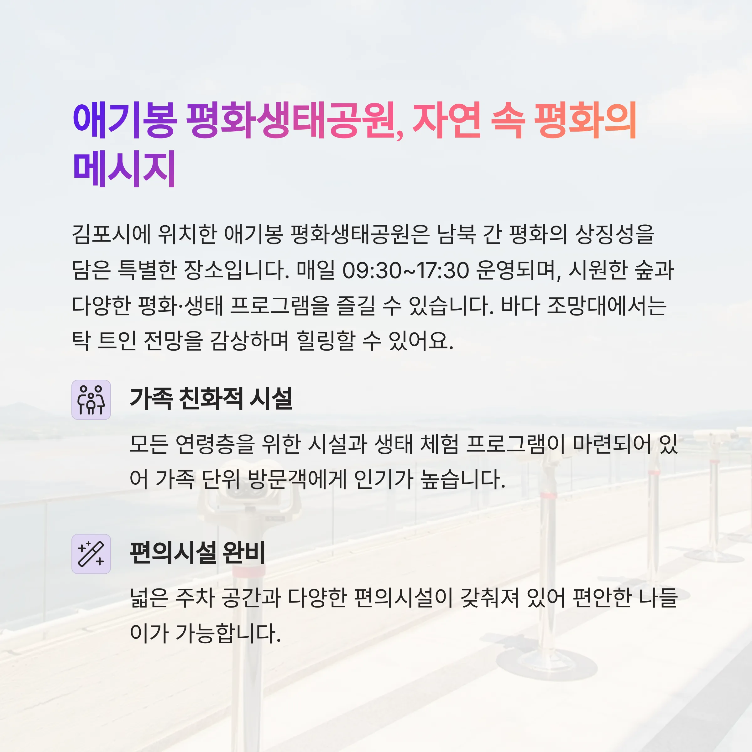 또한 애기봉 평화생태공원은 역사와 자연, 그리고 평화의 의미가 녹아 있는 특별한 공간입니다.