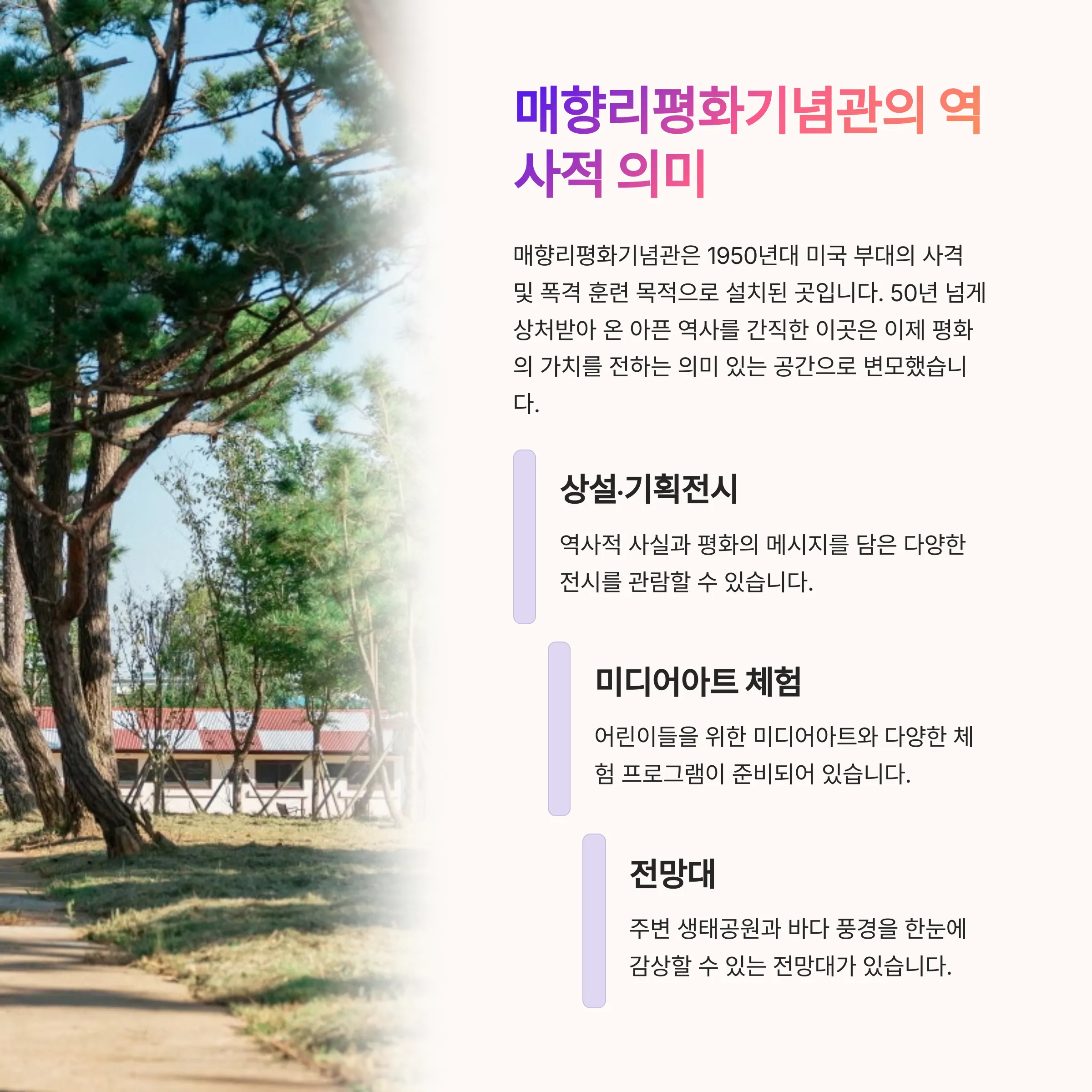 | 매향리평화기념관은 미군 사격장의 아픈 역사를 기억하고 평화의 가치를 전하는 공간입니다. 상설·기획전시와 미군 시설 체험, 어린이 미디어아트 등 다양한 체험 프로그램을 제공합니다. 전망대에서 주변 생태공원과 바다 풍경을 감상할 수 있습니다. 평화생태공원과 연계된 산책, 예술·생태 체험도 즐길 수 있습니다. 관람료와 주차비는 무료로, 가족과 학생들에게 추천되는 복합 문화체험 공간입니다. |