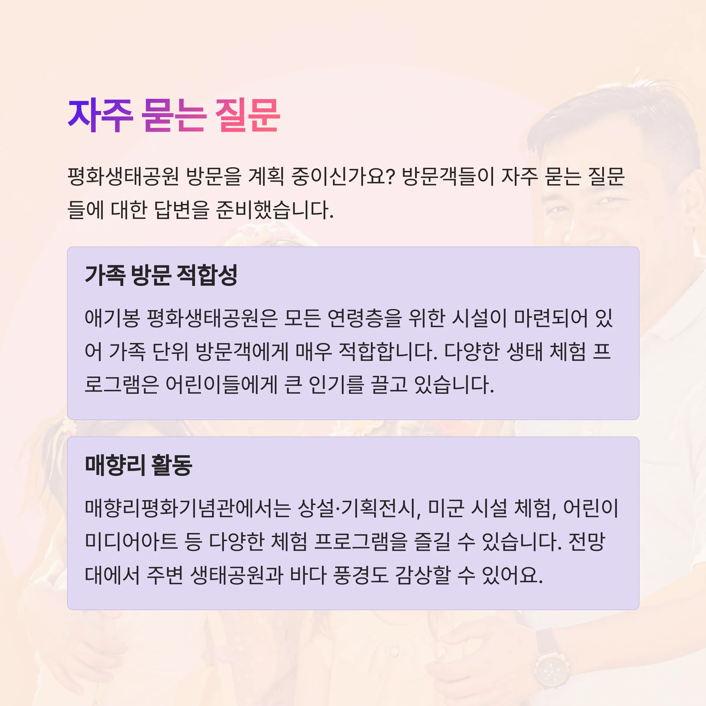| Q. 평화생태공원은 어린이와 가족 단위 방문객도 즐길 수 있을까요? |