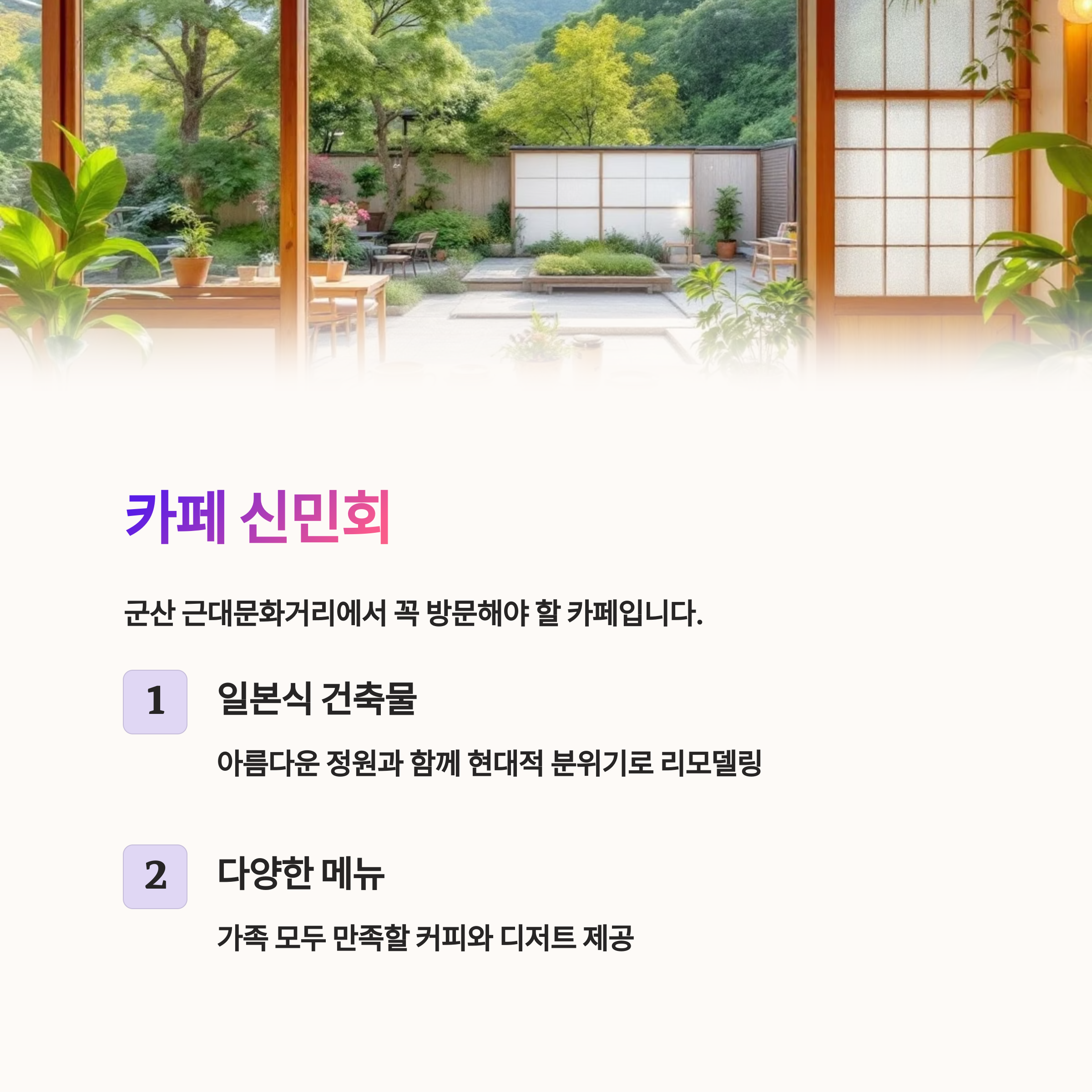 | 카페 신민회는 군산 근대문화거리에서 가장 추천되는 장소 중 하나입니다. 이 카페는 일본식 건축물과 아름다운 정원을 그대로 보존하면서 현대적인 분위기로 리모델링되어 색다른 경험을 제공합니다. 메뉴에는 다양한 커피와 디저트가 준비되어 있으며, 가족 모두 만족할 만한 휴식 공간으로 제격입니다. 주변 관광 명소와 가까운 거리에 있어 여행 중간에 휴식과 추억을 쌓기 좋은 곳으로 평가받고 있습니다. 특히 카페 신민회 인근에 공영주차장이 있어 방문 시 주차도 매우 편리하며, 많은 방문객들의 높은 평점을 받고 있습니다. |
