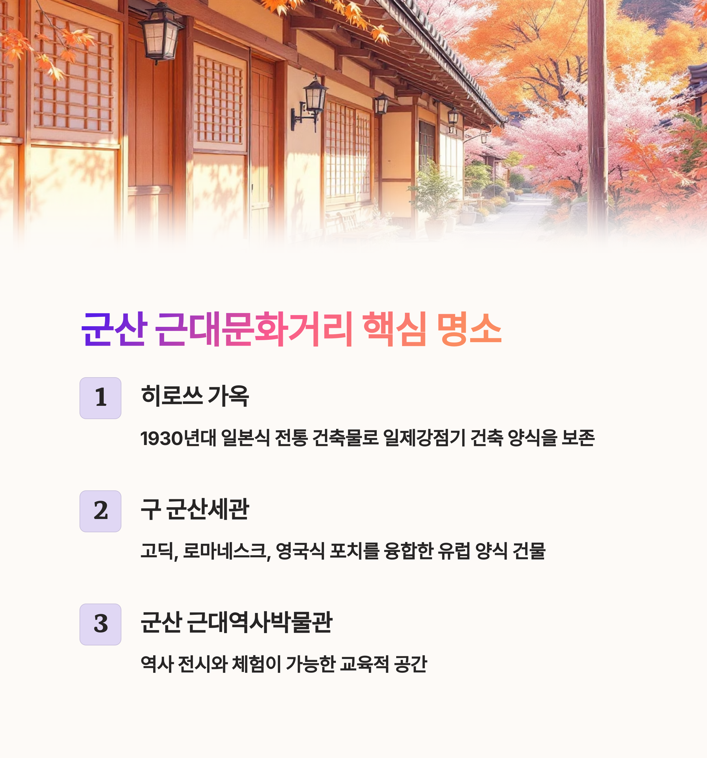 | 대표 명소 | 히로쓰 가옥, 구 군산세관 근대역사박물관, 이성당 빵집 |