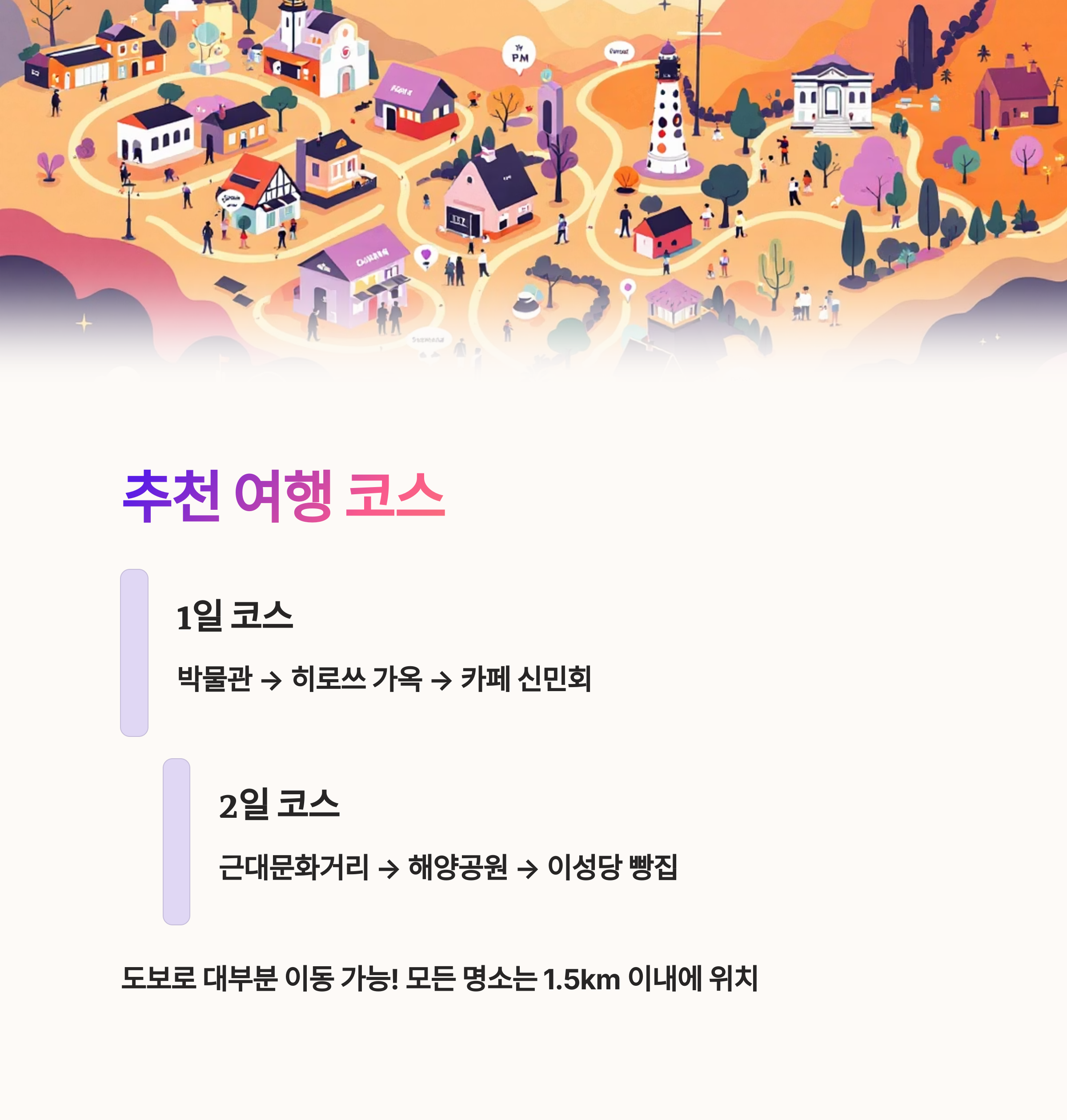 | 추천 코스 | 1-day: 박물관→가옥→카페 2-day: 근대거리→해양공원 |
