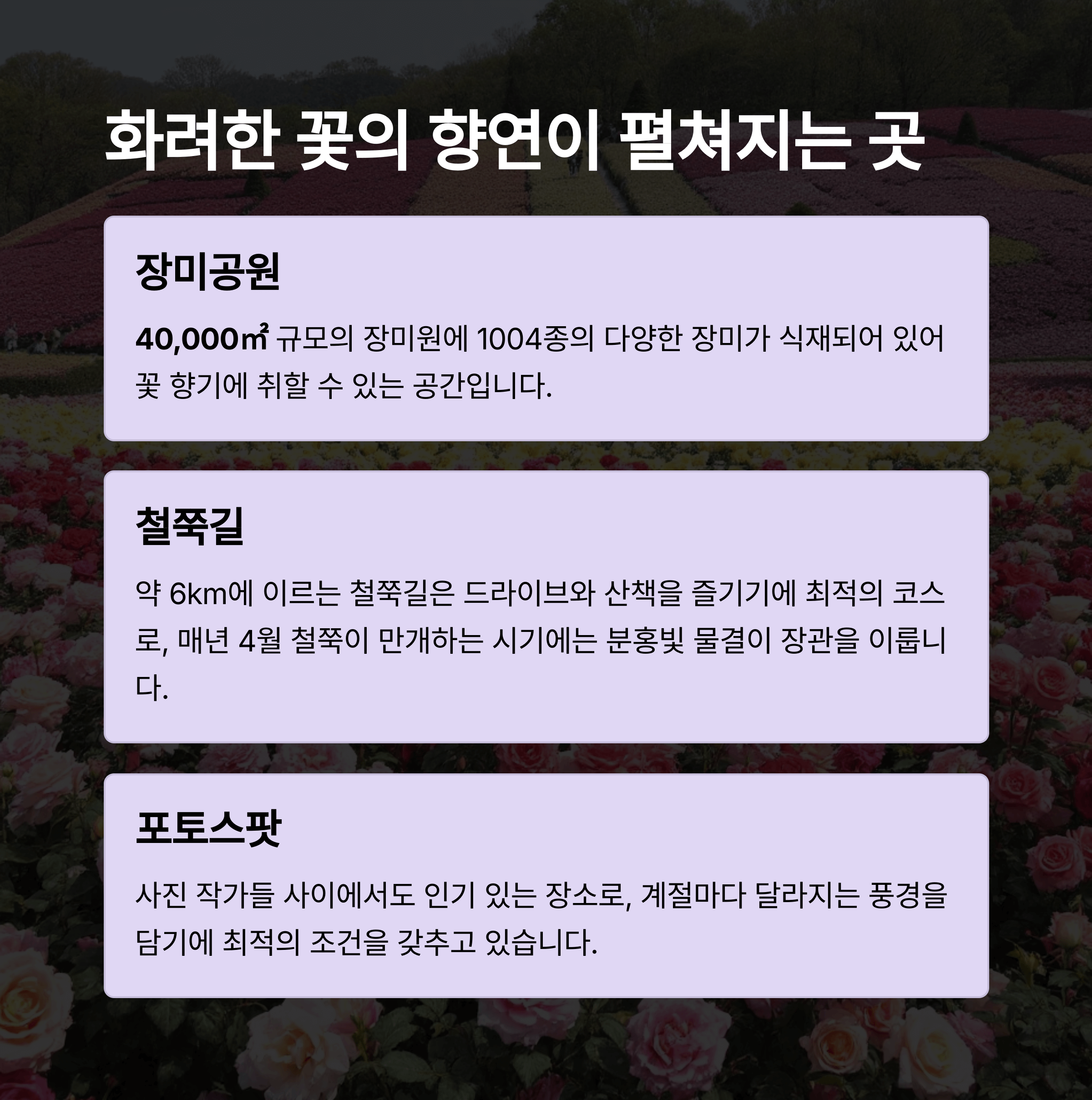 대규모 철쭉길(6km)과 놀이시설이 결합된 추천 여행지입니다.