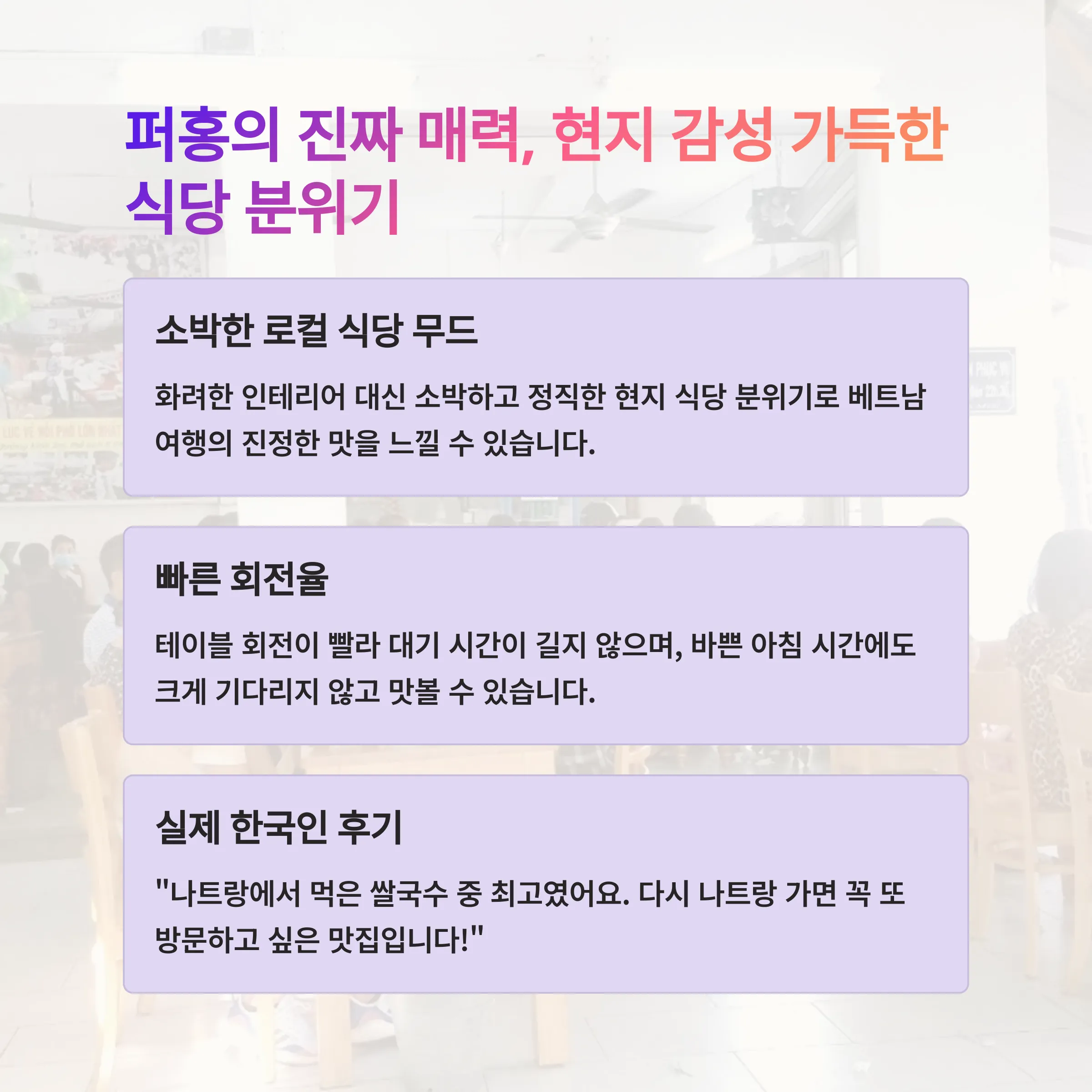 조용하고 편안한 분위기에서 현지의 쌀국수 문화를 경험하고 싶은 분들에게 꼭 방문을 추천합니다.