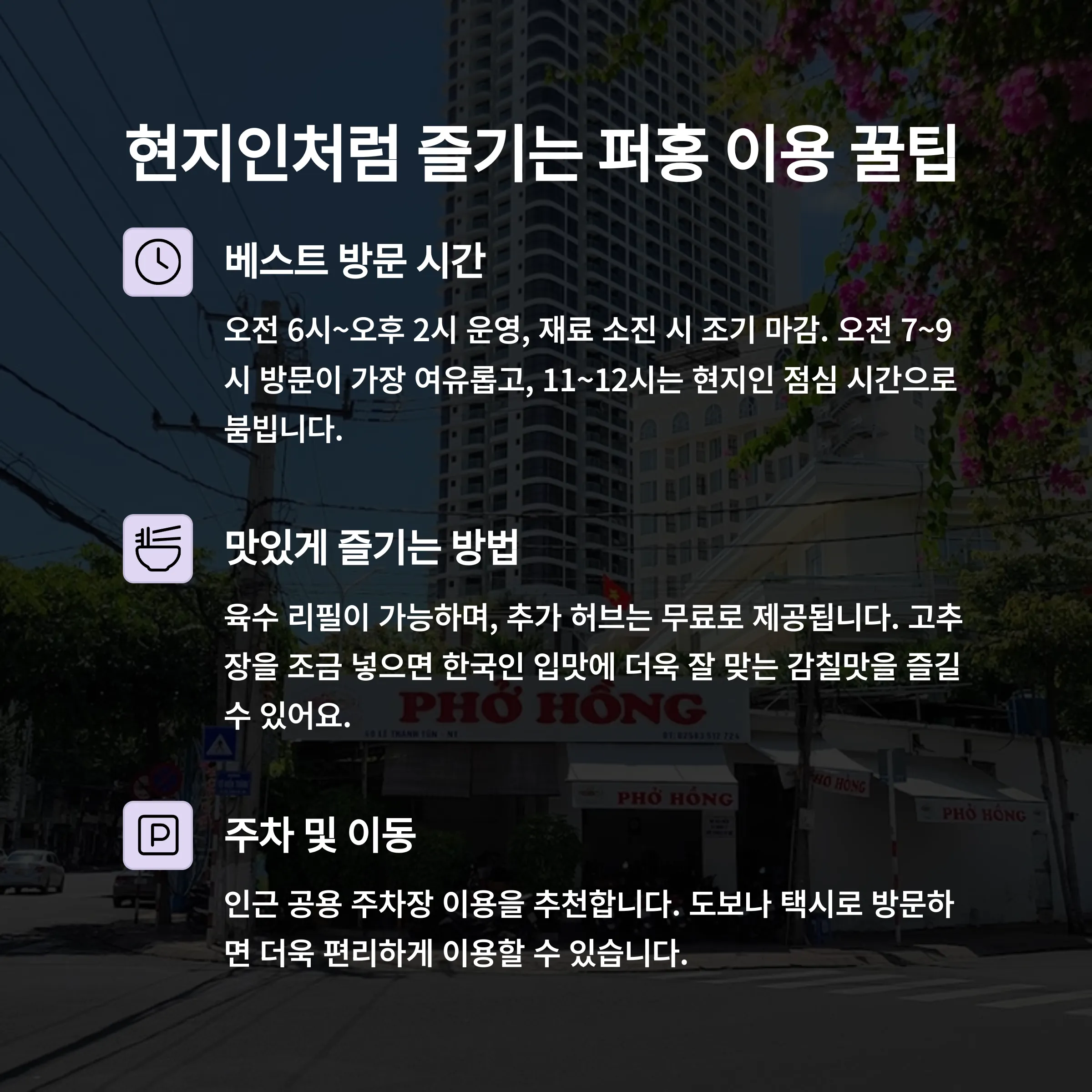 퍼홍(Pho Hong)은 나트랑의 대표적인 쌀국수 맛집으로, 여행객과 현지인 모두에게 사랑받고 있습니다.