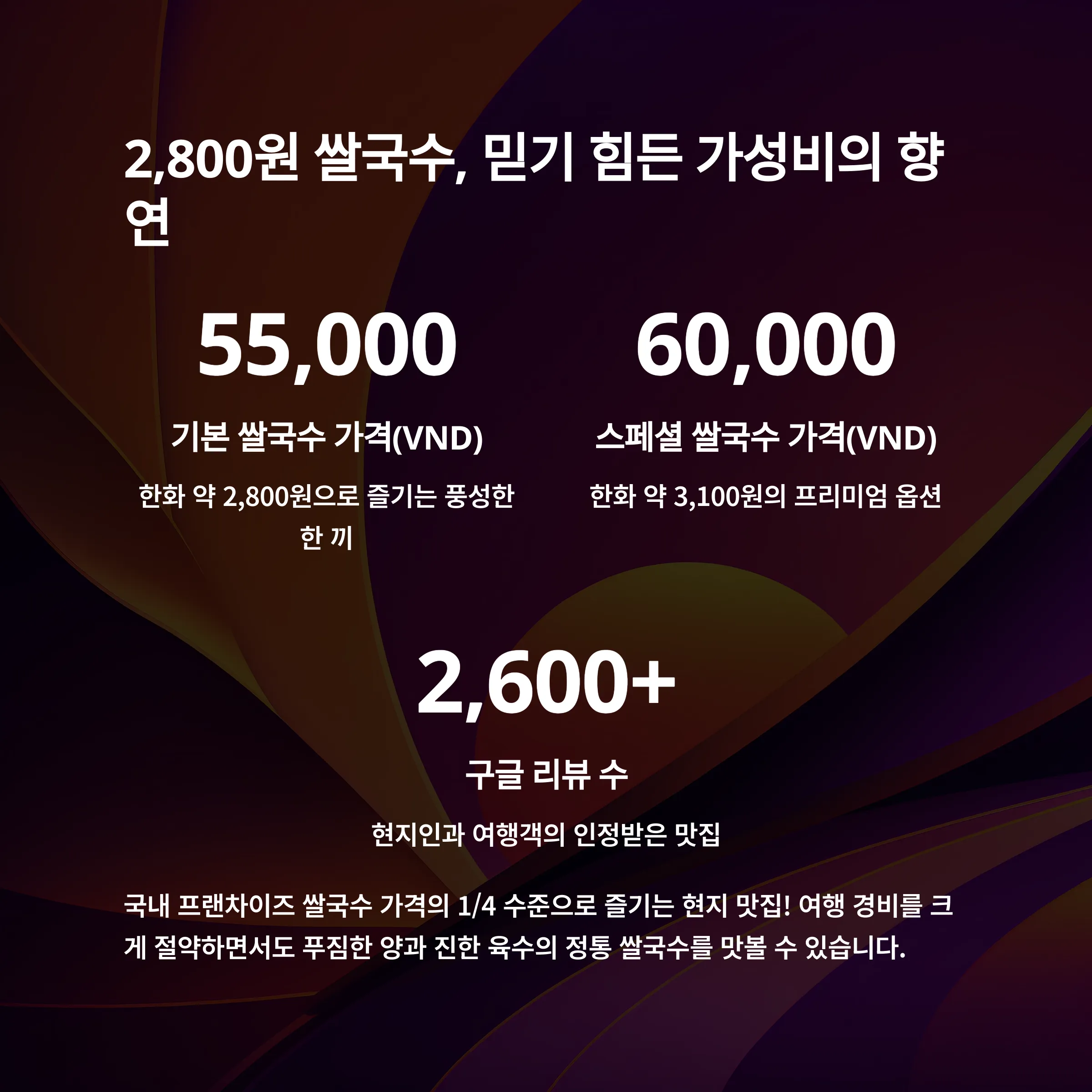 가장 돋보이는 특징 중 하나는 55,000 VND의 가격으로 한화 약 2,800원 정도로 부담 없이 한 끼 식사를 즐길 수 있다는 점입니다.