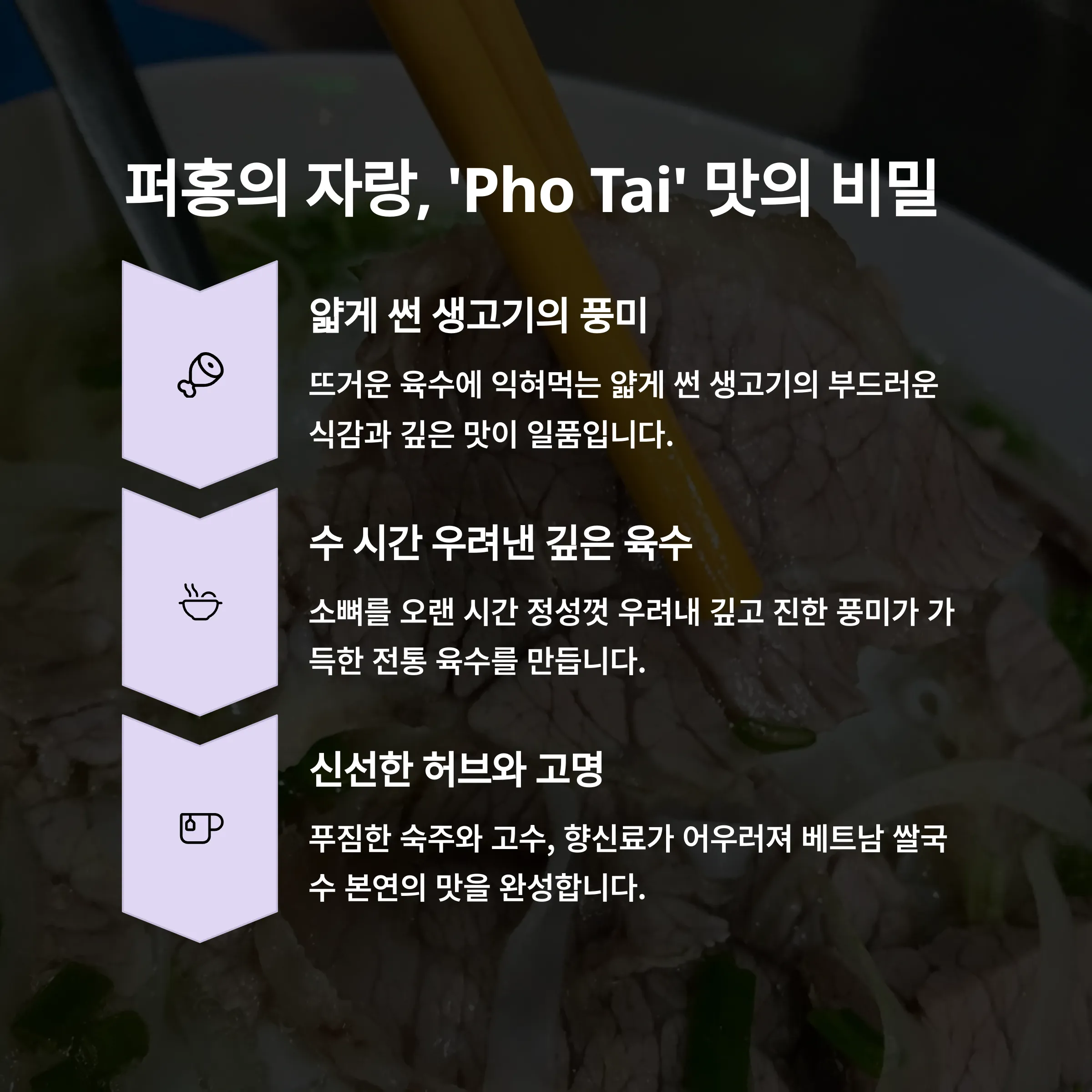 | Q. 퍼홍(Pho Hong)의 대표 메뉴, Pho Tai는 어떤 맛인가요? |