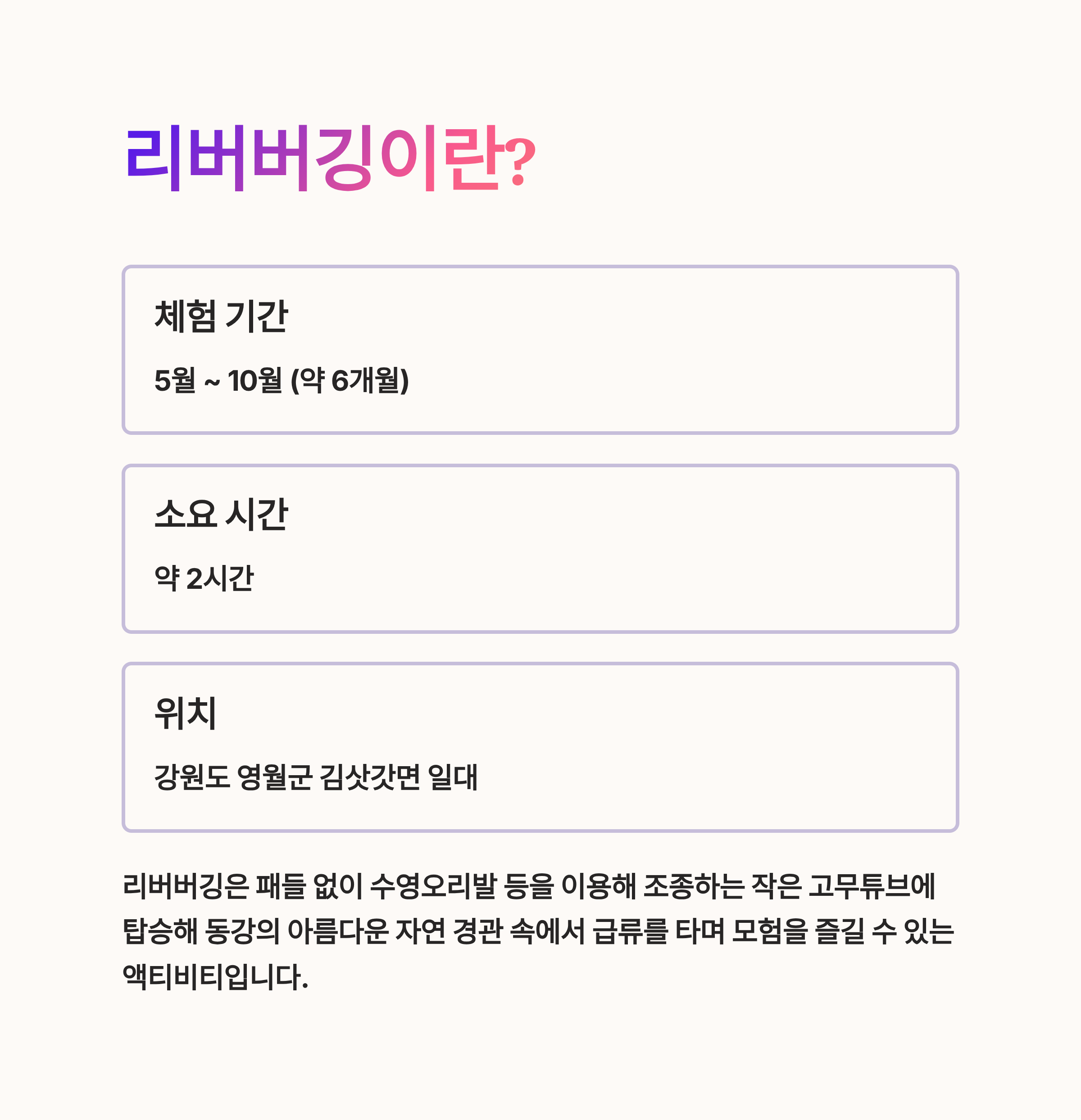 물놀이와 스릴을 동시에 즐길 수 있는 리버버깅은 5월부터 10월까지 약 6개월 동안 운영되며, 약 2시간 동안 체험 가능합니다.
