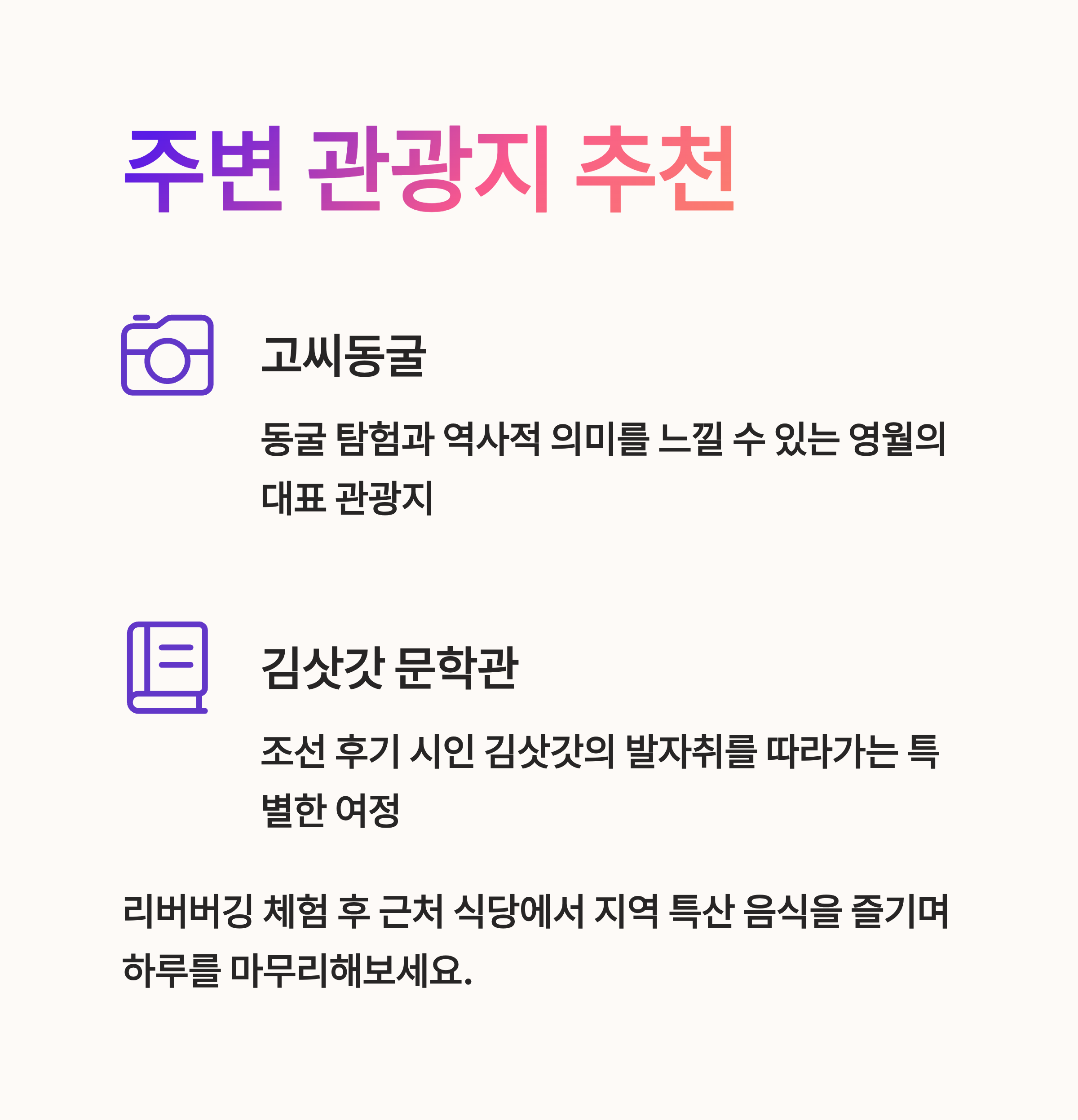 | 리버버깅 체험이 끝난 후 근처 관광 명소를 둘러보며 휴식을 취할 수 있습니다. 대표적으로 고씨동굴은 동굴 탐험과 역사적 의미를 느낄 수 있는 영월의 대표적인 관광지 중 하나로 추천됩니다. 또한 김삿갓 문학관은 조선 후기에 활동했던 시인 김삿갓의 발자취를 따라갈 수 있는 특별한 여정을 제공합니다. 리버버깅 근처에 위치한 숙소는 워케이션에도 적합하며, 동강을 배경으로 한 아름다운 풍경에서 여유롭게 힐링할 수 있습니다. 저녁에는 근처 식당이나 카페에서 지역 특산 음식과 음료를 즐기며 하루를 마무리하는 것도 좋은 선택입니다. |