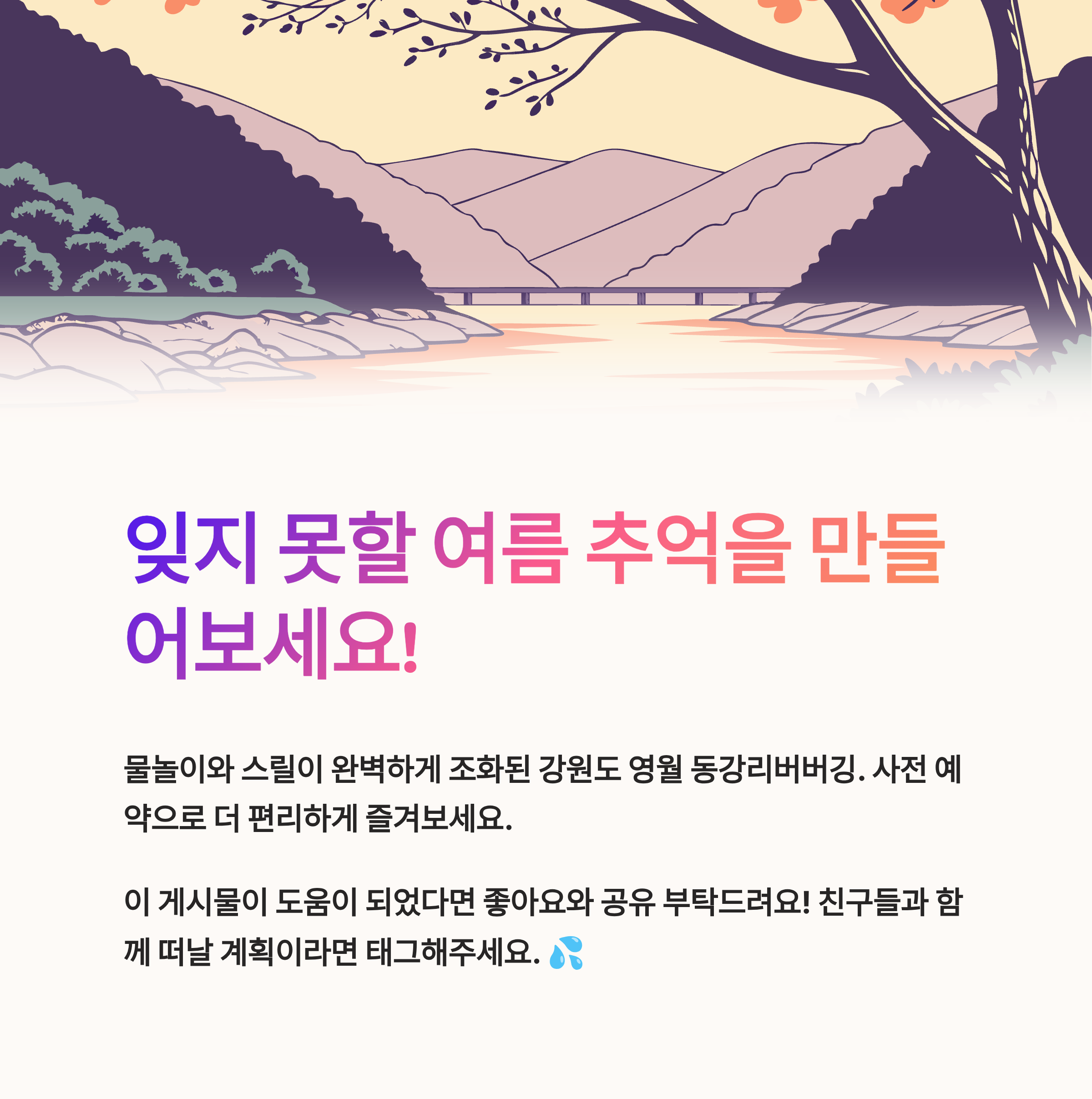 오늘 주제는 바로 강원도 영월 동강리버버깅입니다! 귀중한 정보를 바탕으로 꼭 맞는 여행 준비하세요.
