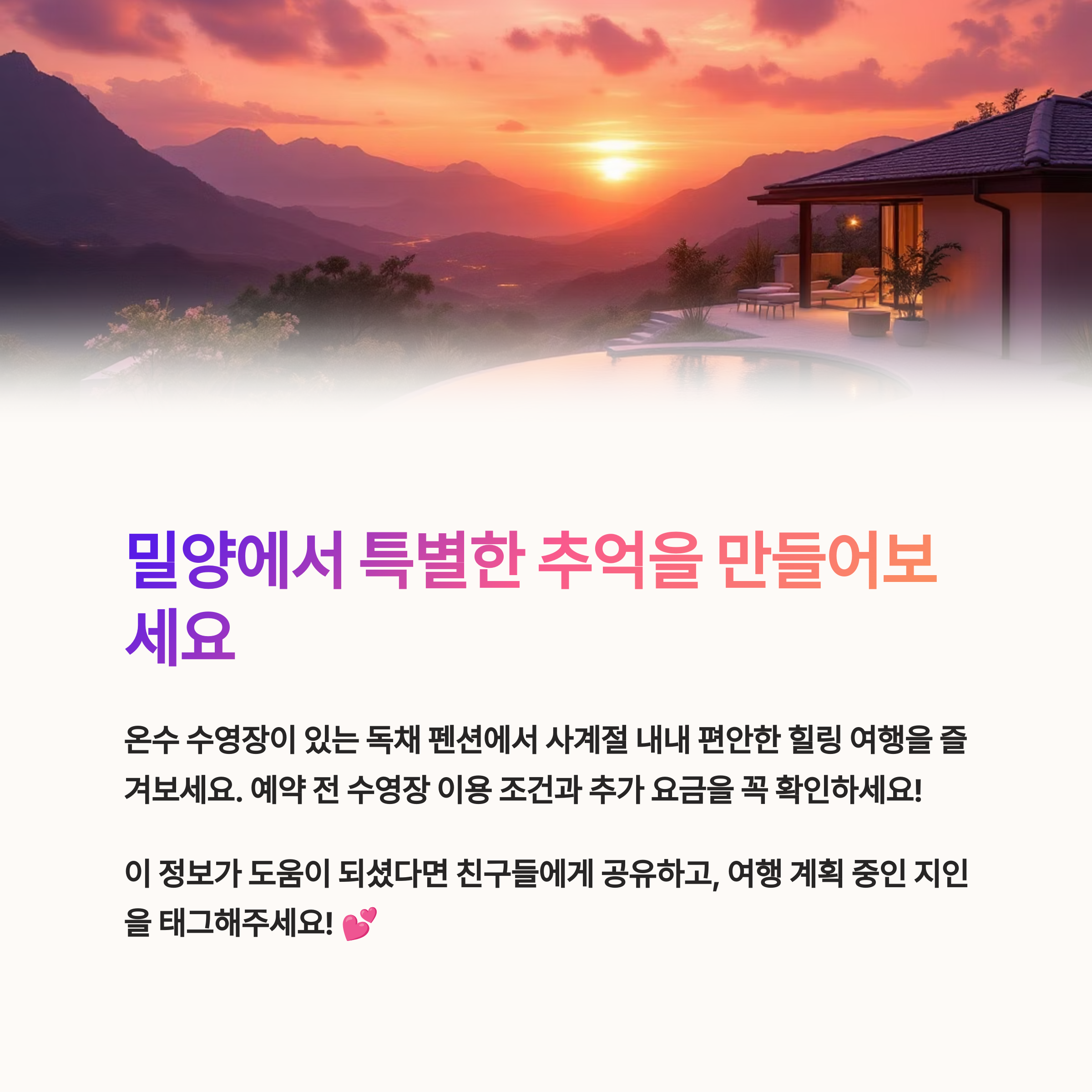 밀양에서의 특별한 힐링 여행이 여러분을 기다립니다. 지금 바로 예약을 통해 추억을 만들어 보세요!