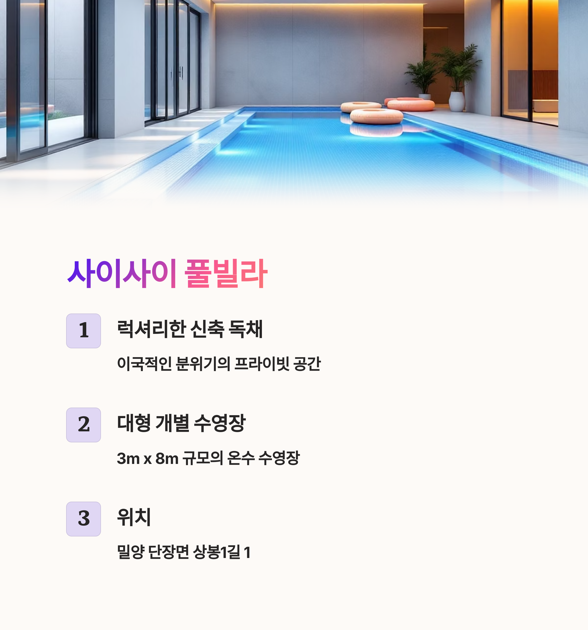 | 사이사이 풀빌라 | 3m x 8m 대형 개별수영장 | 신축 독채 | 밀양 단장면 상봉1길 1 |