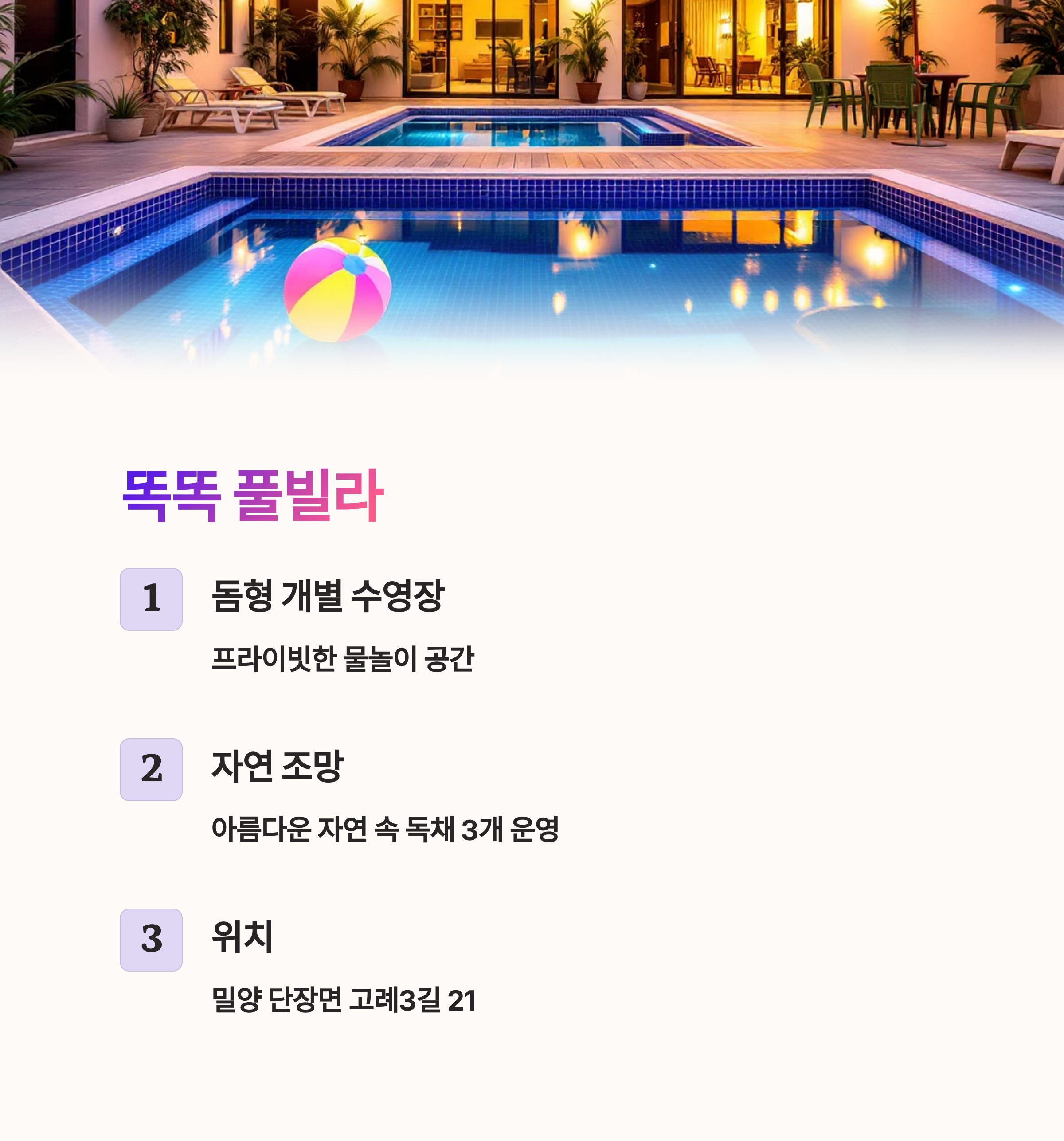 대표적으로 가족 단위 여행지로 적합한 피자마을 밀양펜션, 세련된 신축 독채인 사이사이 풀빌라, 그리고 자연 조망이 뛰어난 똑똑 풀빌라를 추천드립니다.