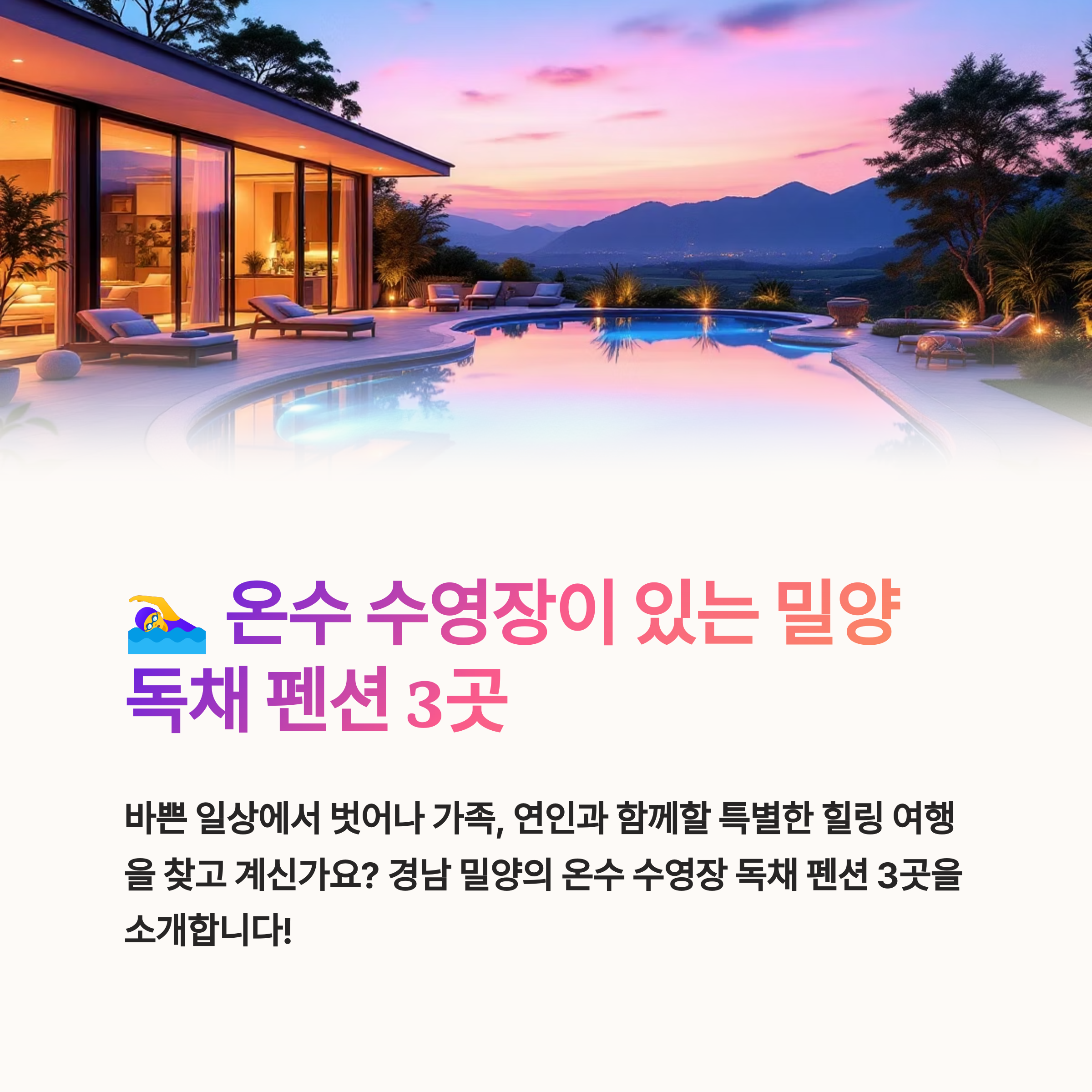 오늘은 경남 밀양 지역에서 특히 인기가 높은 온수 수영장을 갖춘 독채 펜션을 준비했습니다.