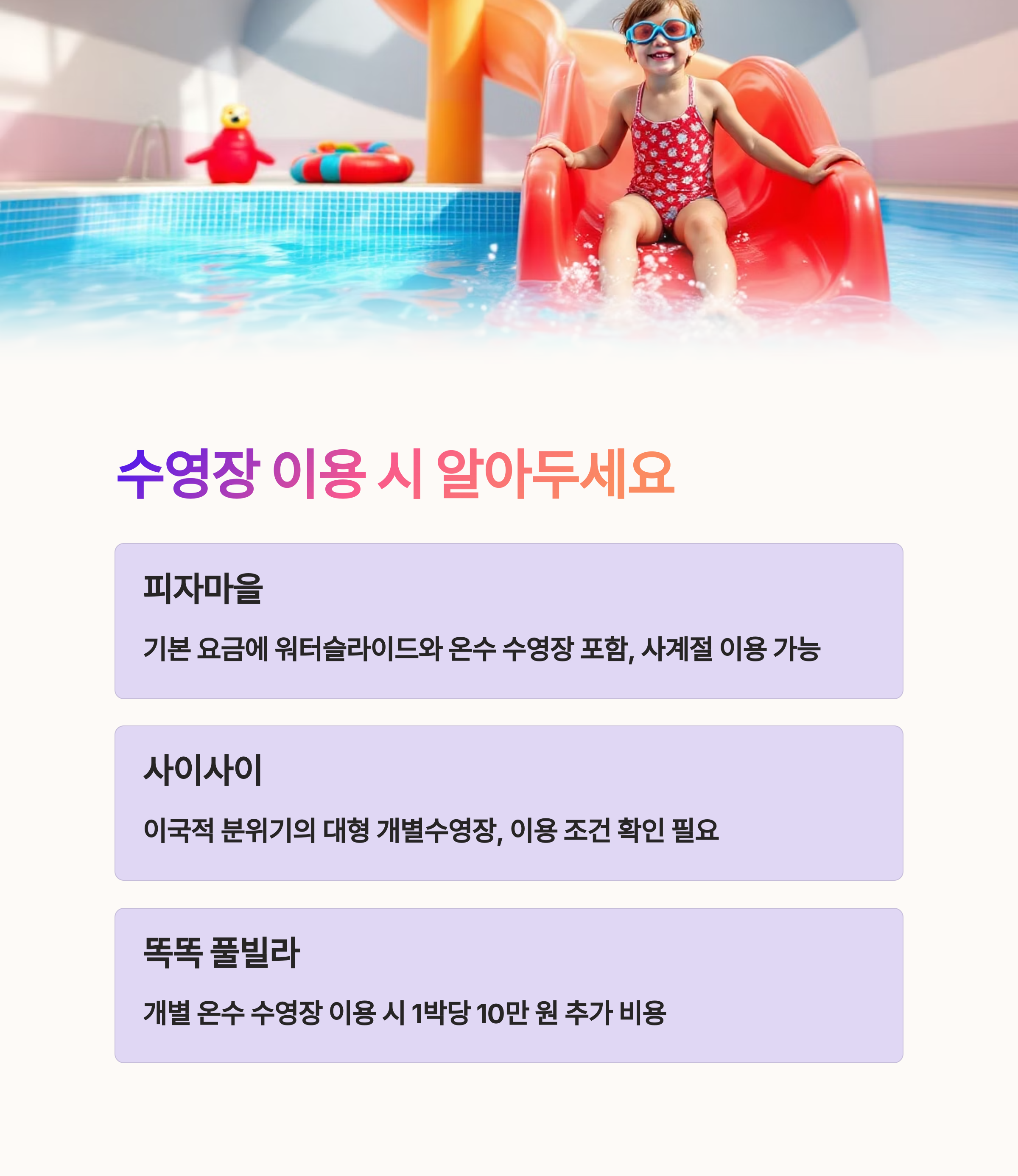다만, 예약 시 수영장 이용 규정이나 추가 요금 등을 사전에 꼼꼼히 확인하는 것이 중요합니다.