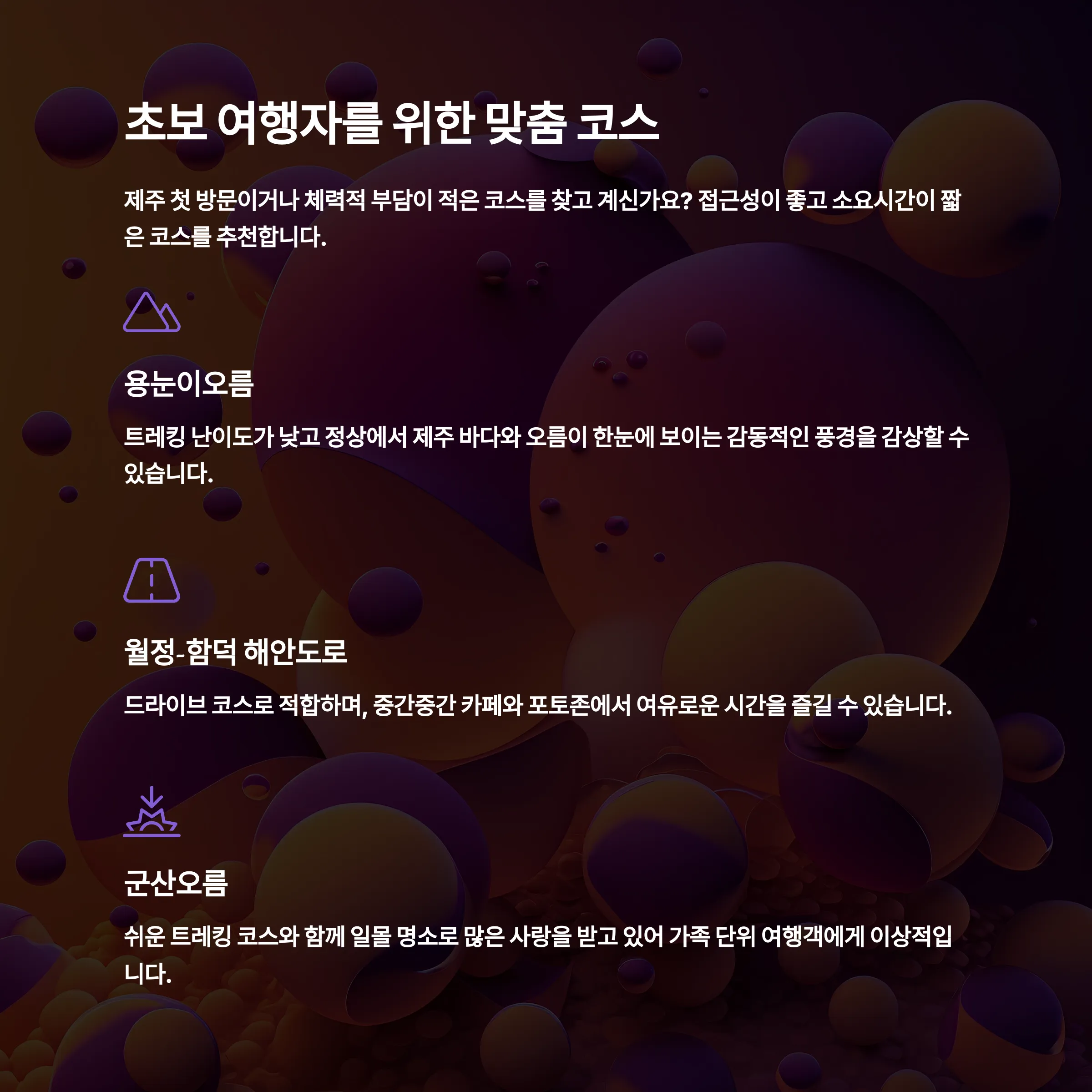 | Q. 초보 여행자에게 적합한 오름과 해안 코스는 무엇인가요? |