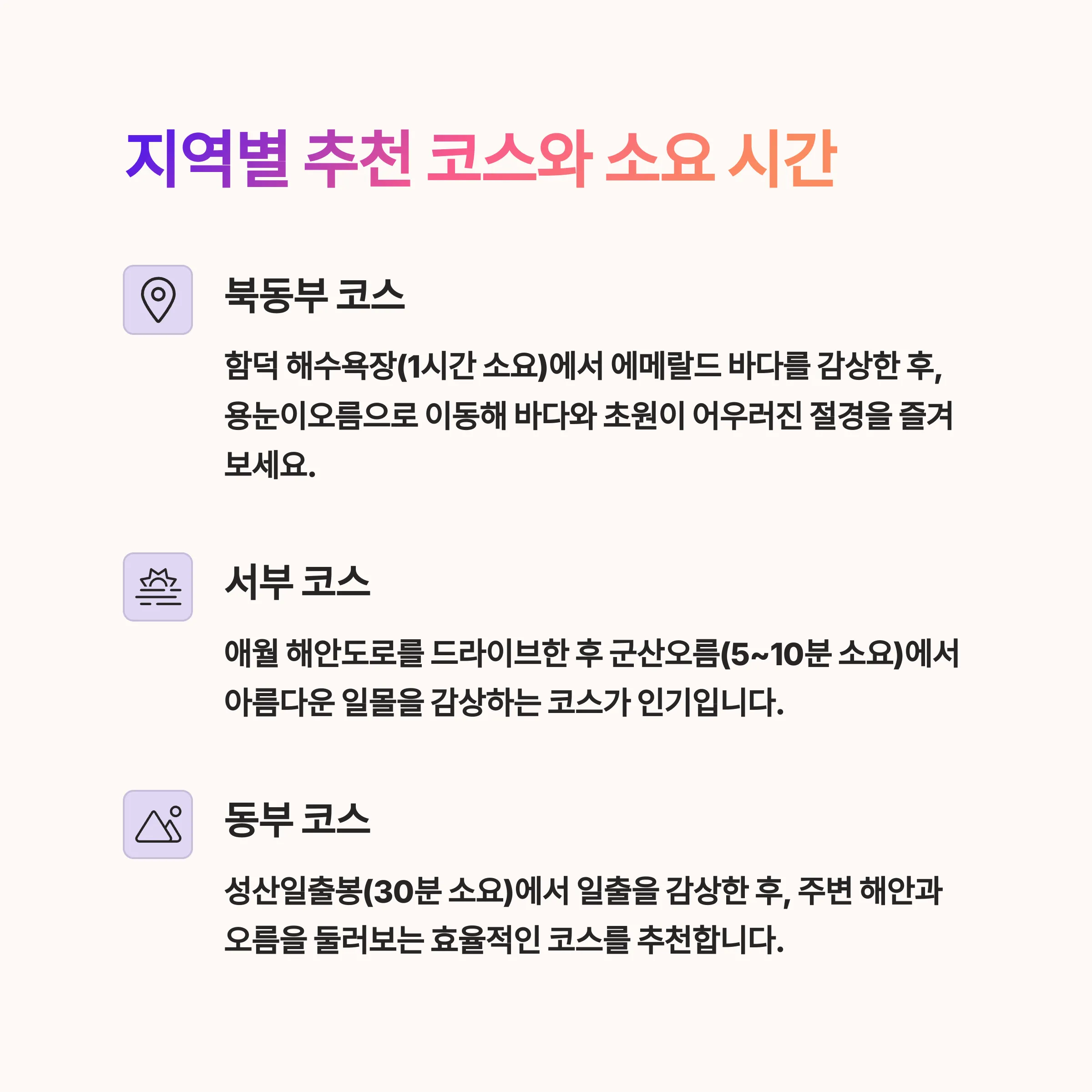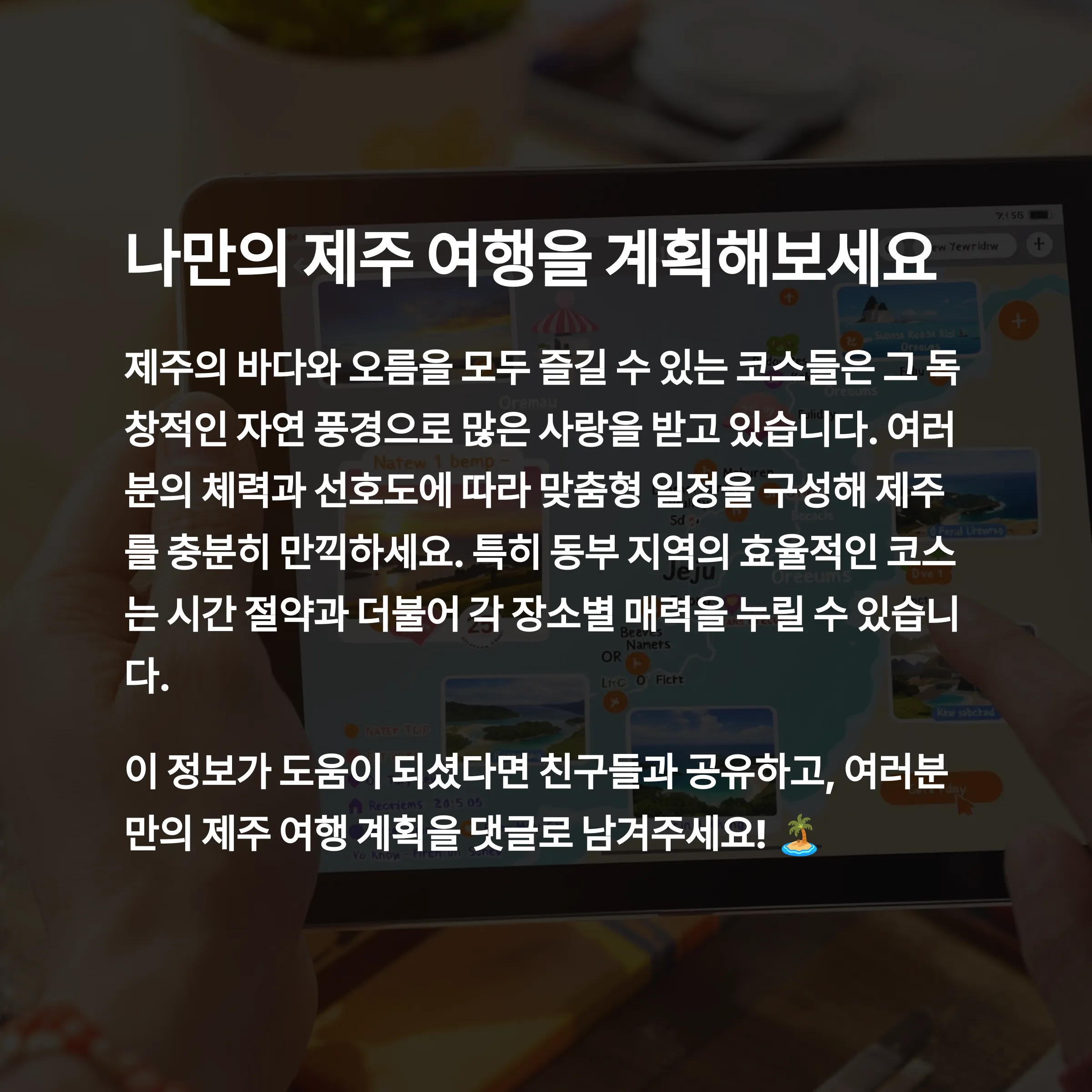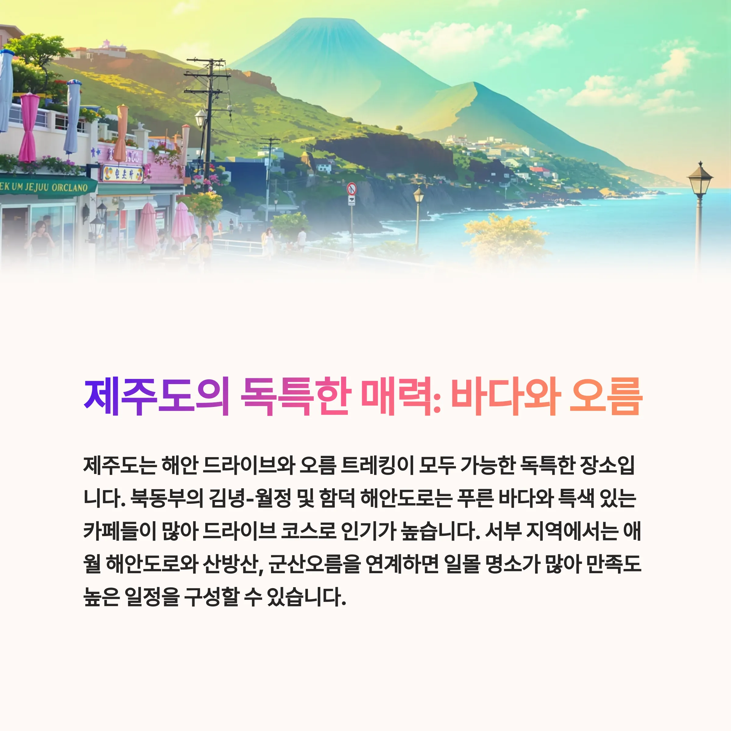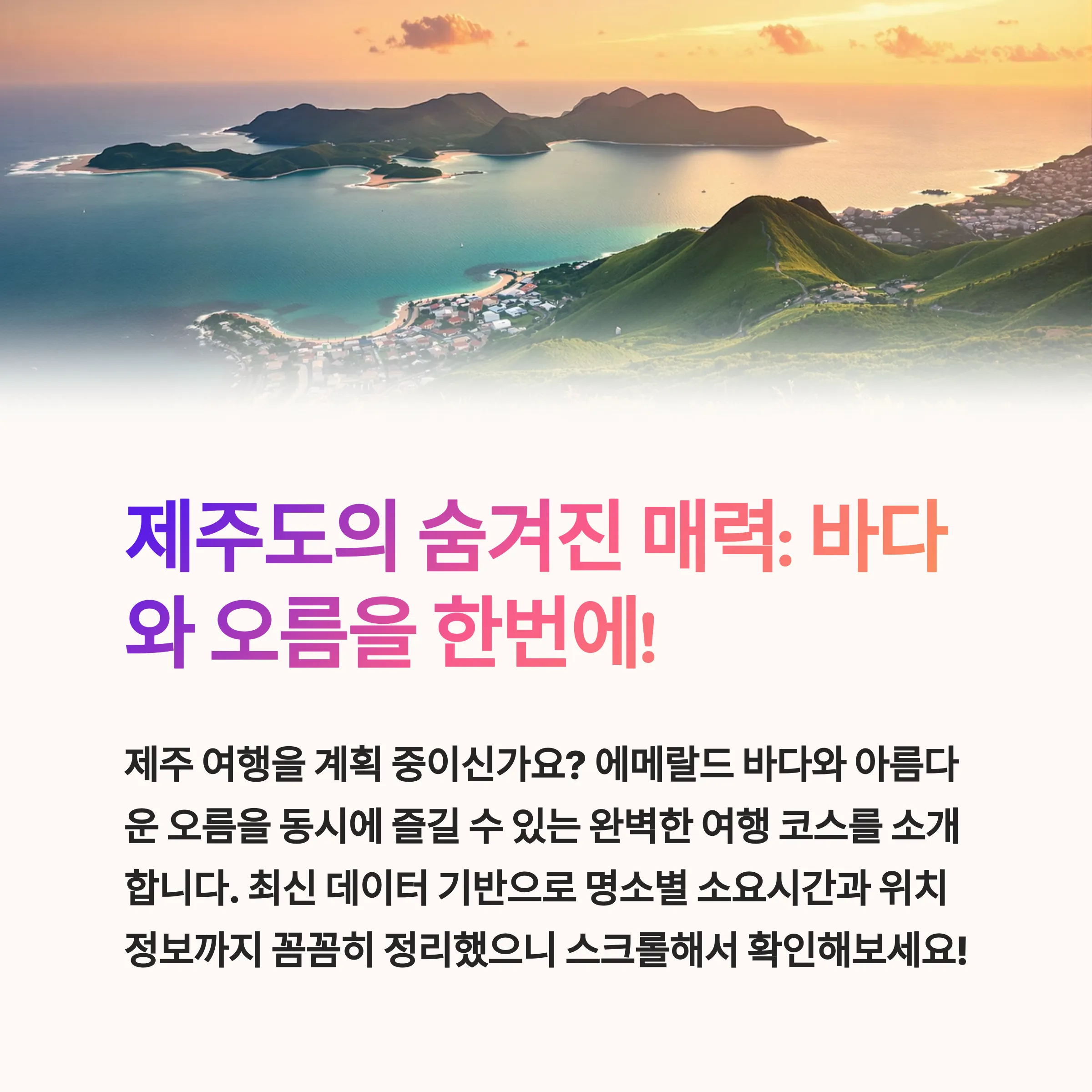 여행님, 제주 여행은 해안과 오름을 동시에 즐기는 독특한 매력이죠!