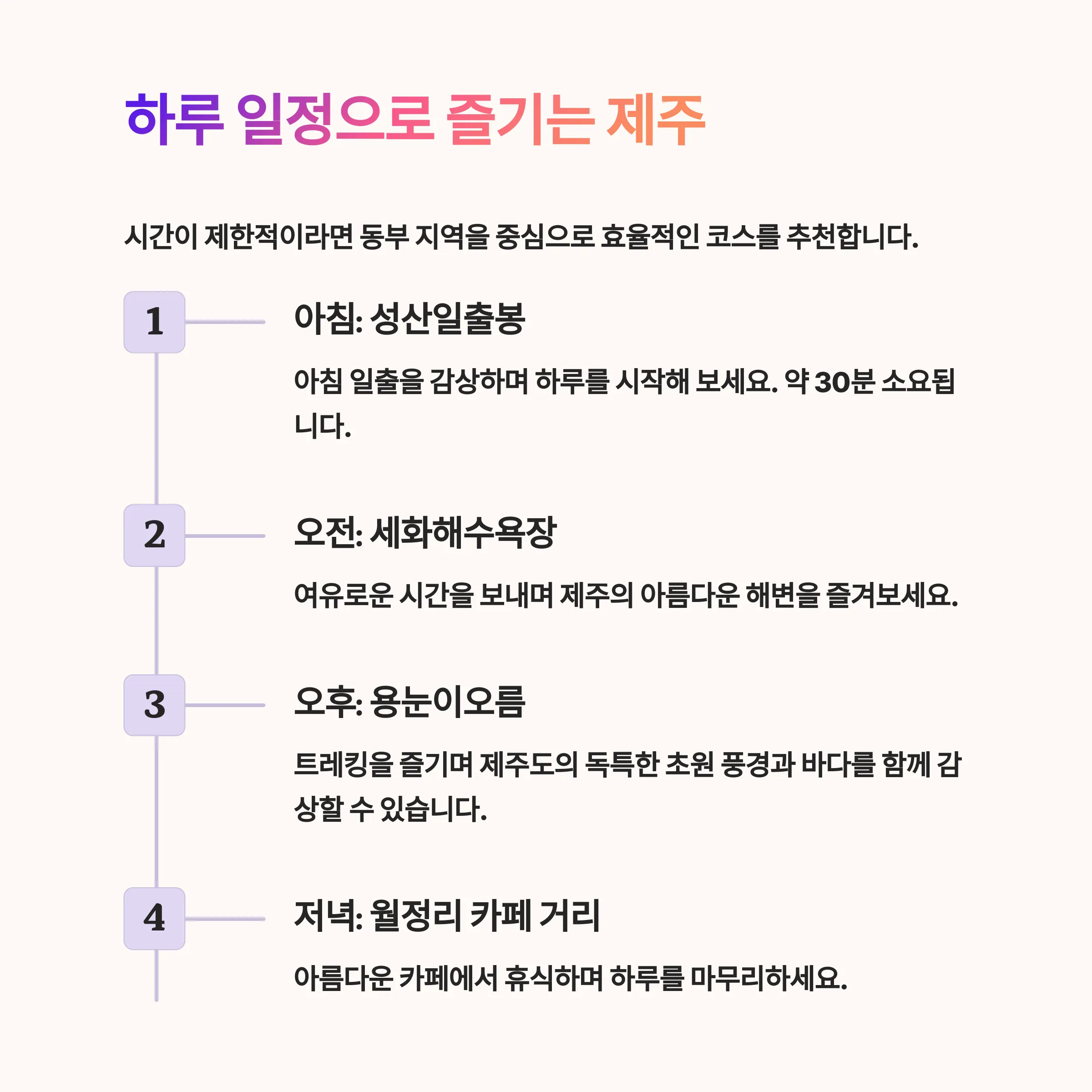 | 하루 일정이라면 동부 지역을 중심으로 효율적인 코스를 짜는 것을 추천합니다. 가장 먼저 성산일출봉에서는 아침 일출을 감상하며 하루를 시작해 보세요. 이후 세화해수욕장에서 여유로운 시간을 보낼 수 있습니다. 두 번째로, 용눈이오름으로 이동해 트레킹을 즐기며 제주도의 독특한 초원 풍경과 바다를 함께 감상할 수 있습니다. 시간에 따라 월정리 카페 거리에서 마무리하며 느긋하게 하루를 마무리해도 좋습니다. 이러한 코스는 이동 거리가 짧아 시간별로 충분한 경험을 할 수 있어 알찬 하루 일정으로 인기입니다. |