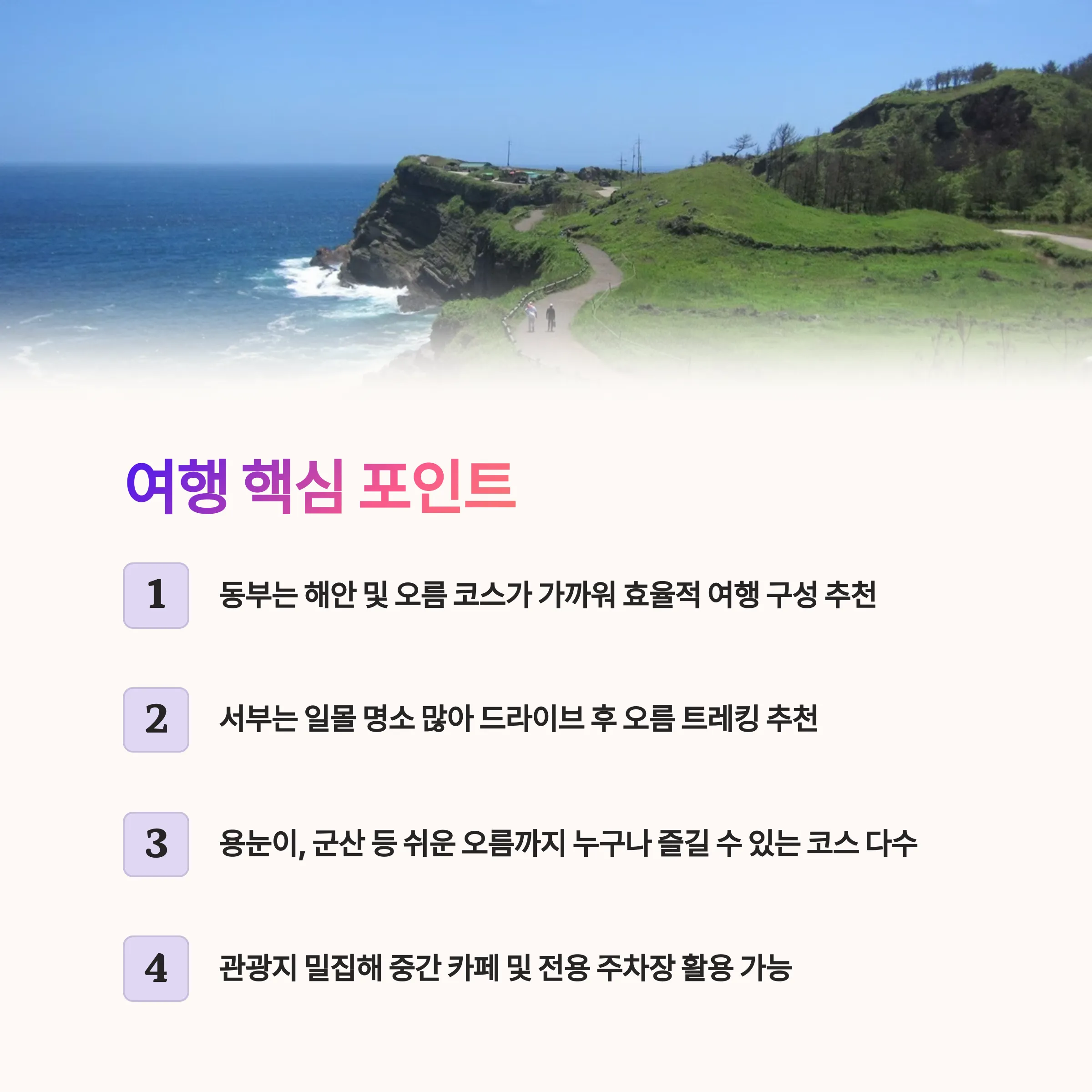 1. 동부는 해안 및 오름 코스가 가까워 효율적 여행 구성 추천