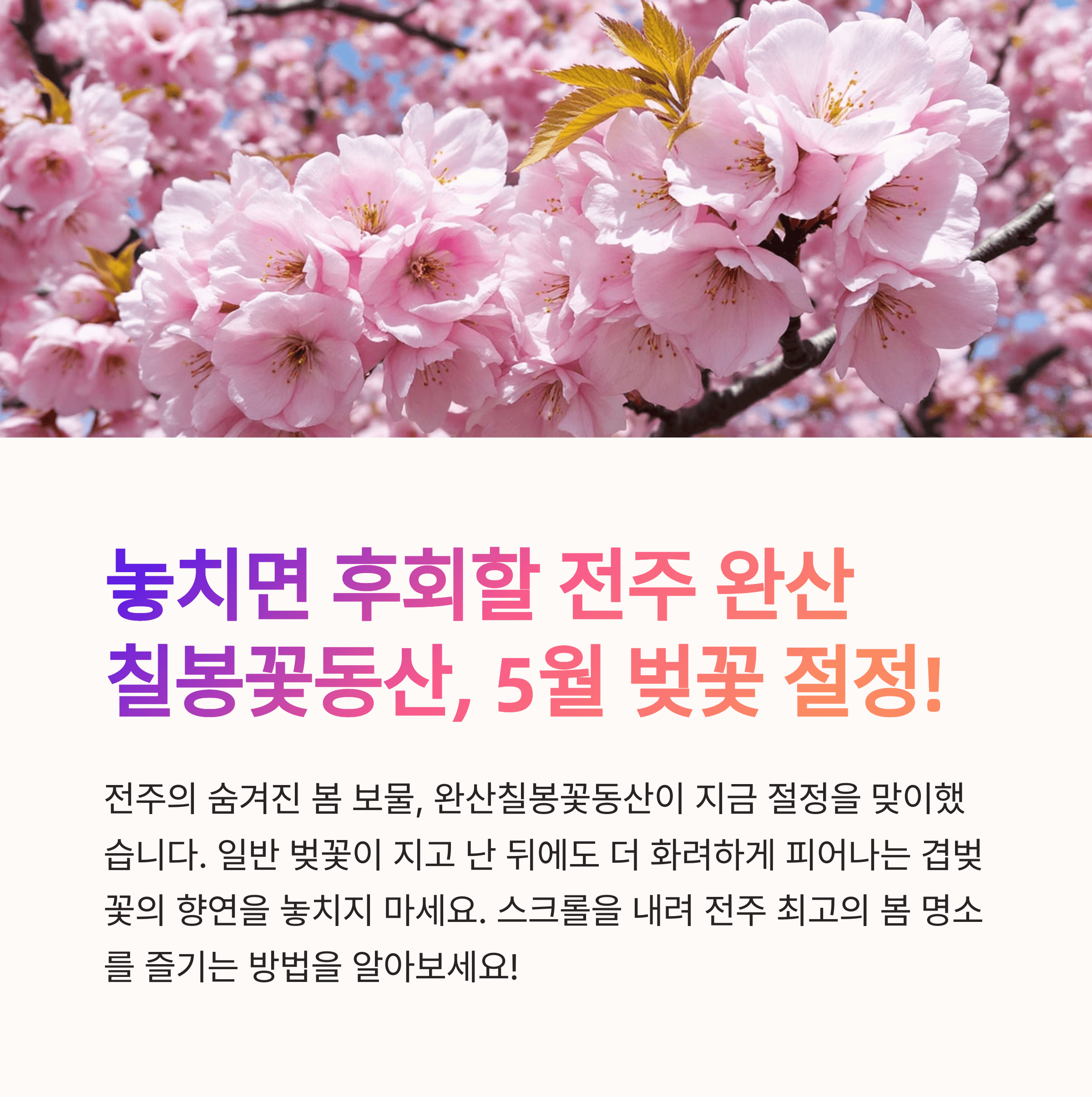 완벽히 만개한 전주 완산칠봉꽃동산의 겹벚꽃 소식과 함께, 효율적이고 빠른 관광 정보를 준비했습니다.