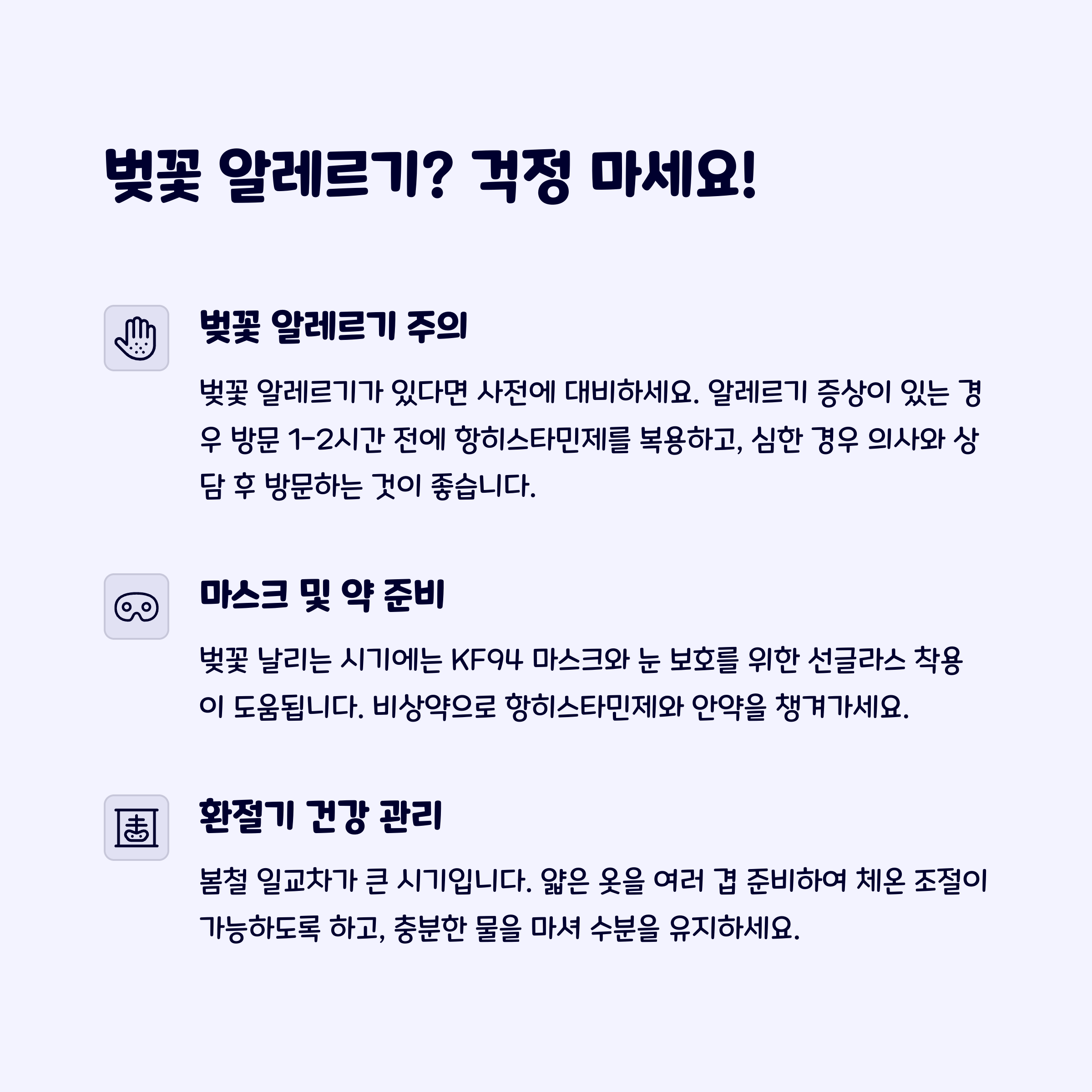 벚꽃 알레르기가 있으신 분은 알레르기 약이나 방진 마스크를 챙기시는 것이 중요합니다.