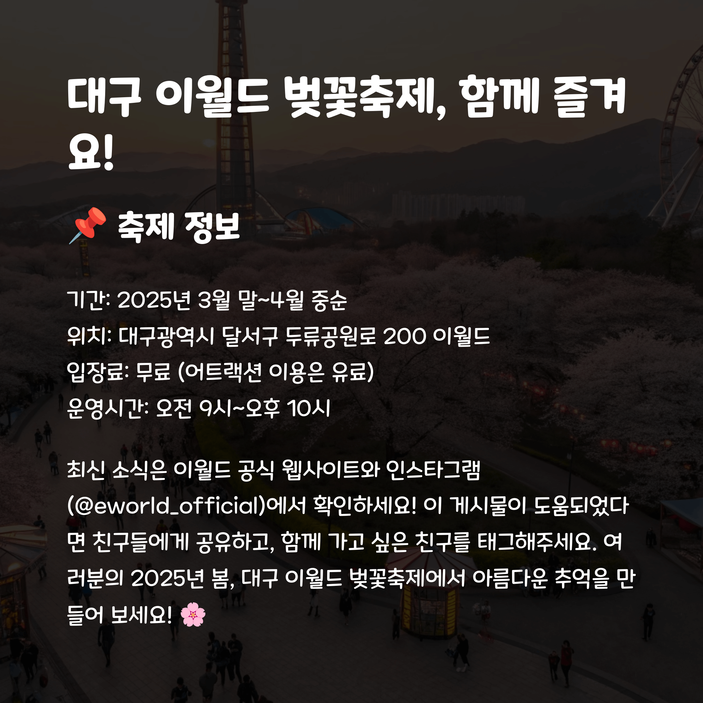 오늘은 곧 다가올 2025년 대구 이월드 벚꽃 축제에 대한 소식을 준비했어요.