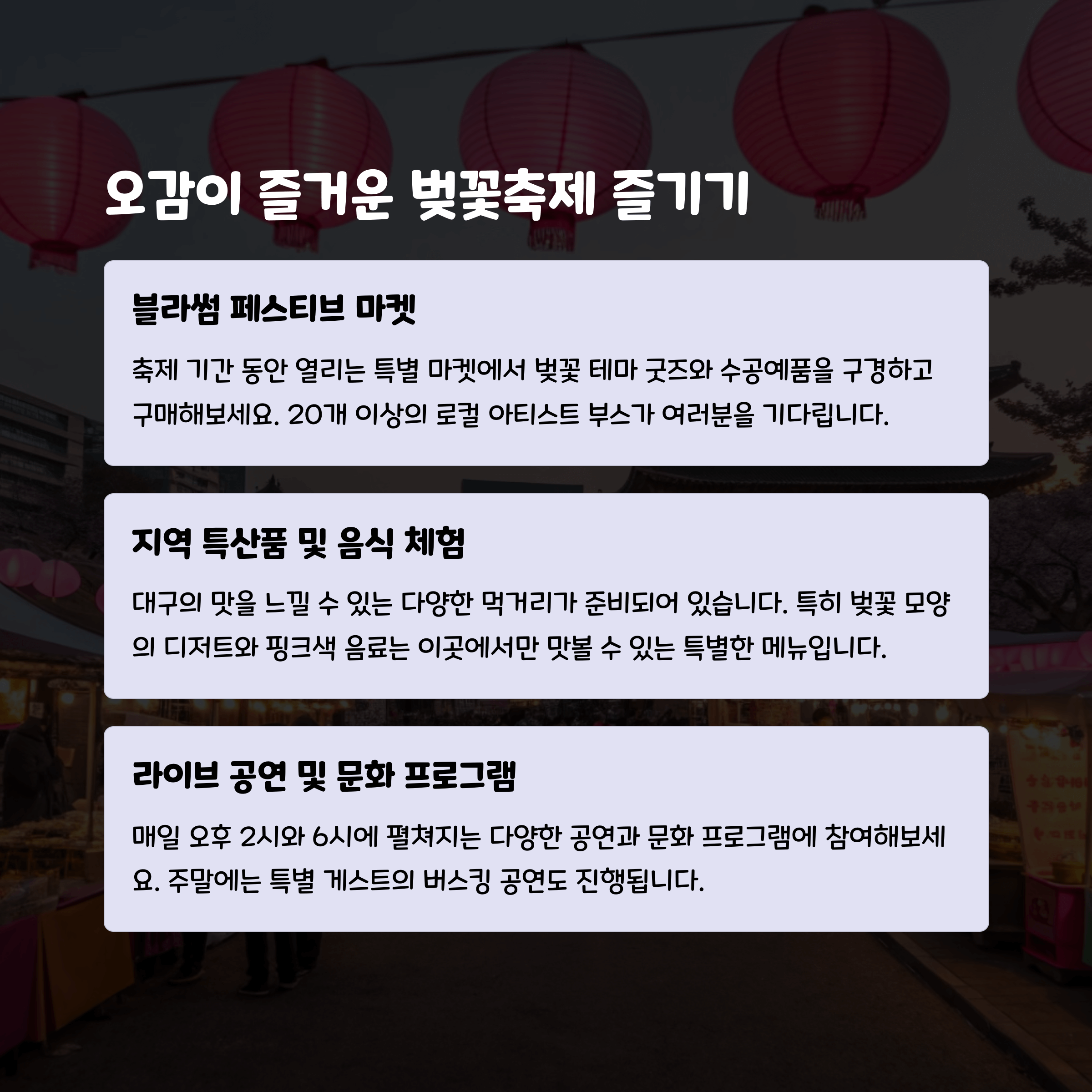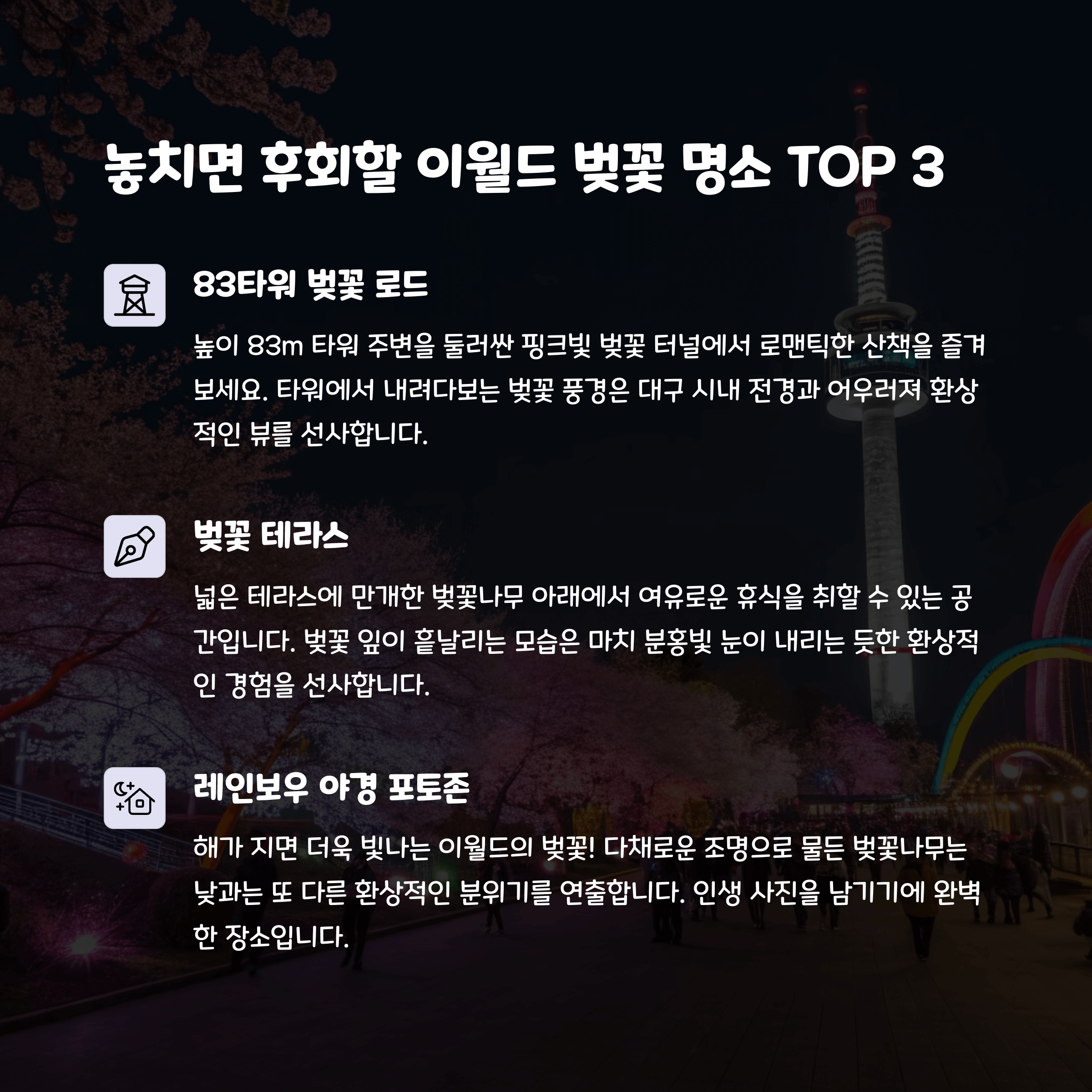 | Q. 대구 이월드 벚꽃축제 야간 관람의 특별한 매력은 무엇인가요? |