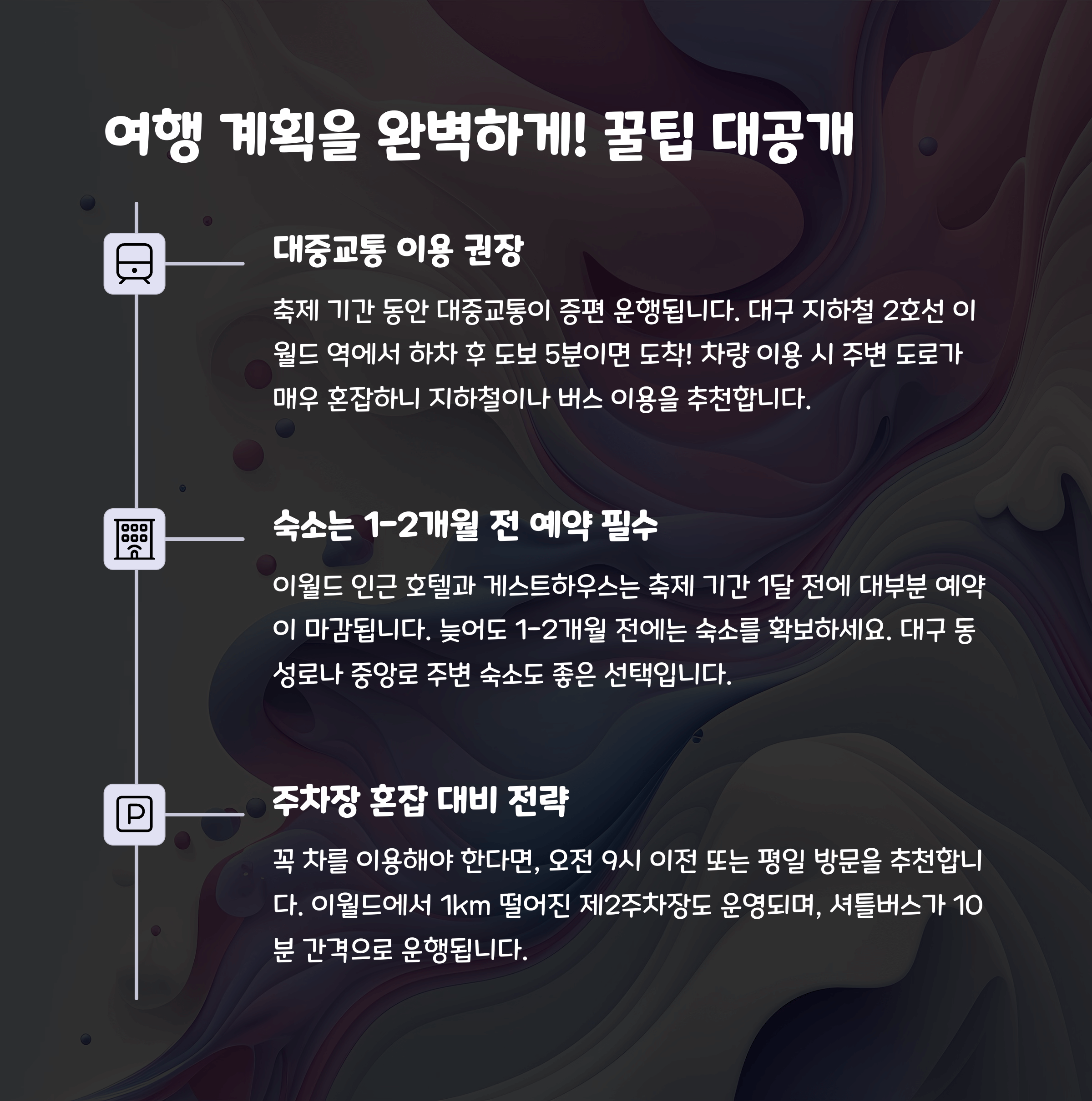 대중교통이나 이월드 주차장 상황을 미리 체크하는 것이 중요합니다.