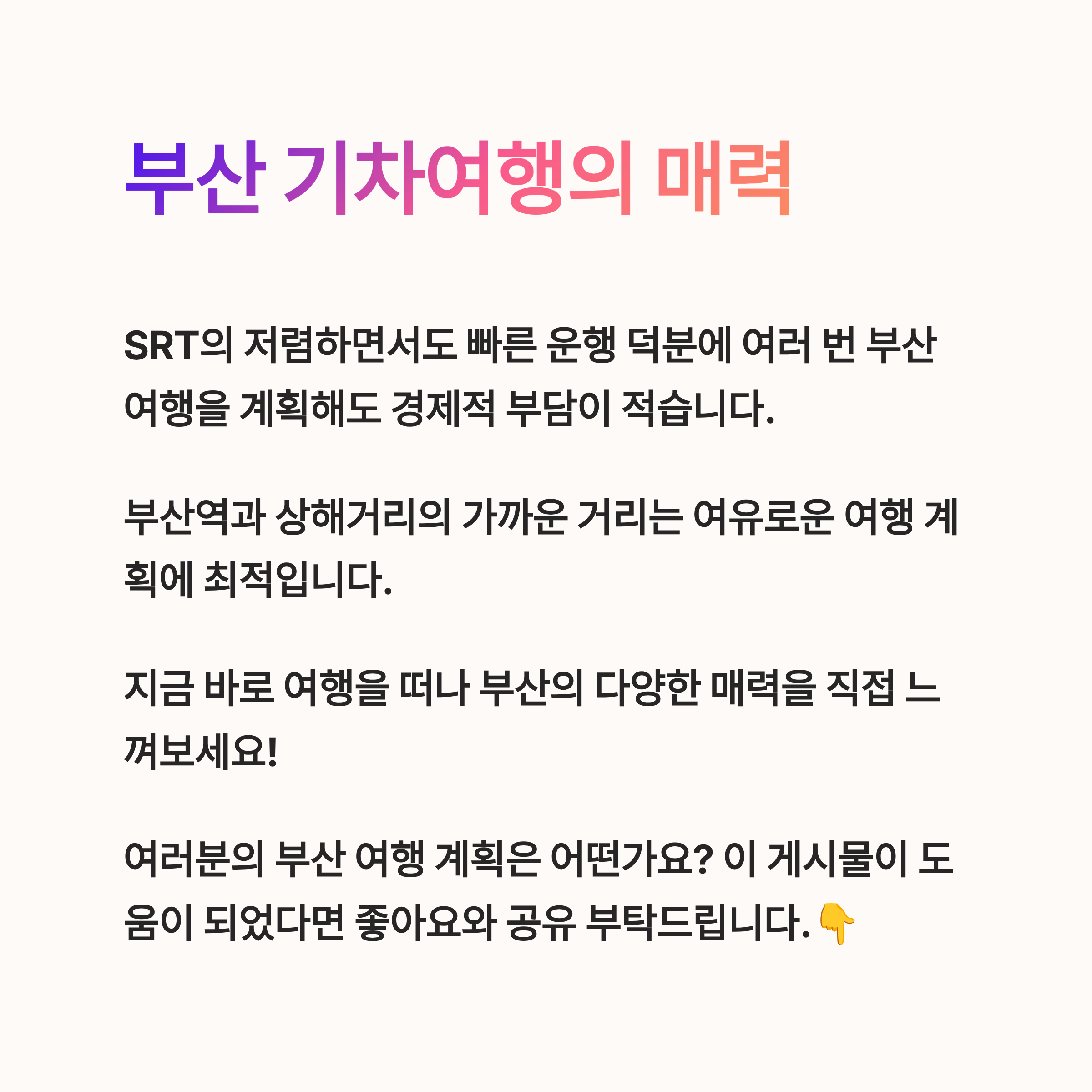 마지막으로, SRT의 저렴하면서도 빠른 운행 덕분에 여러 번 부산 여행을 계획해도 경제적 부담이 적습니다.