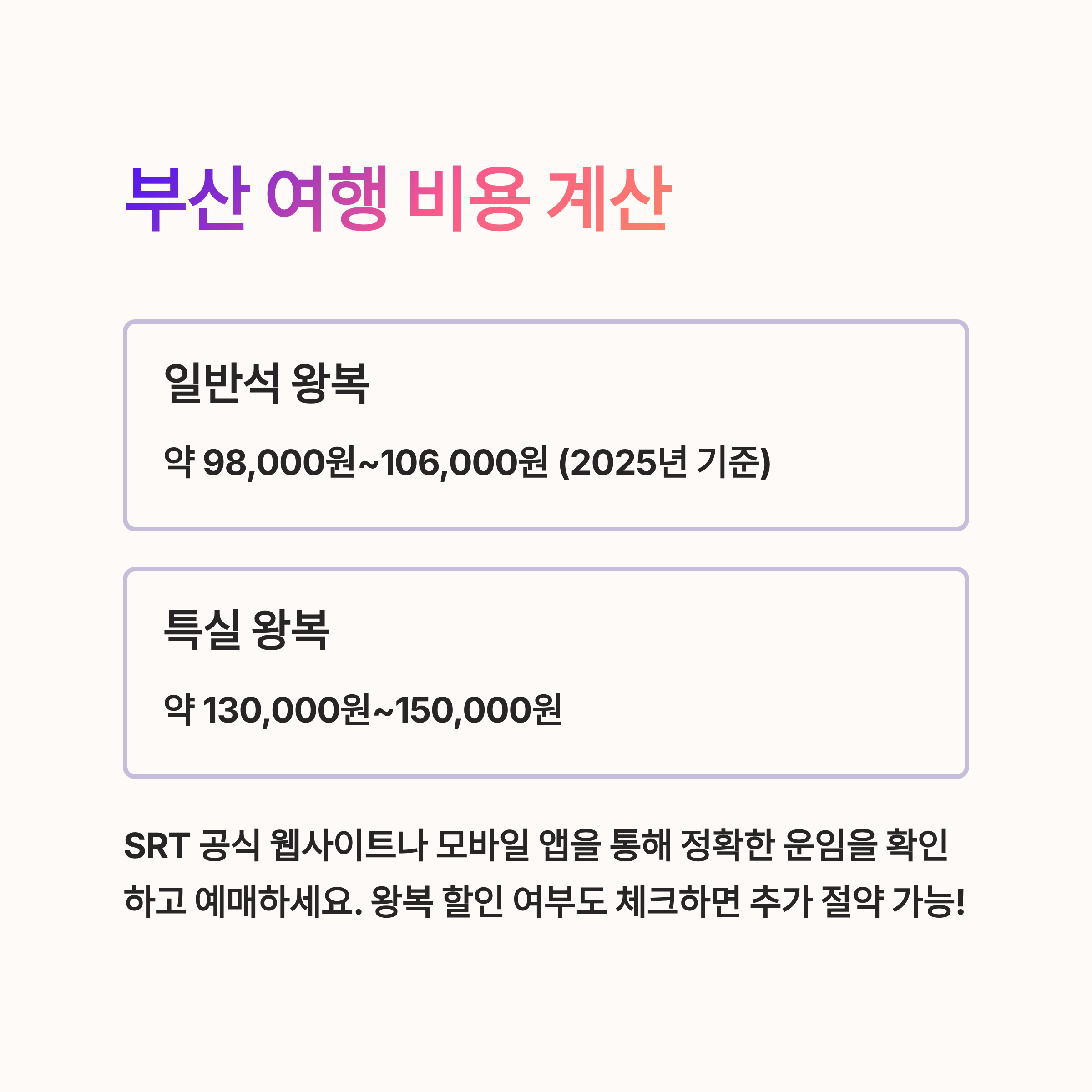 | Q. SRT 편도로 부산까지 여행하면 왕복 요금은 얼마나 들까요? |