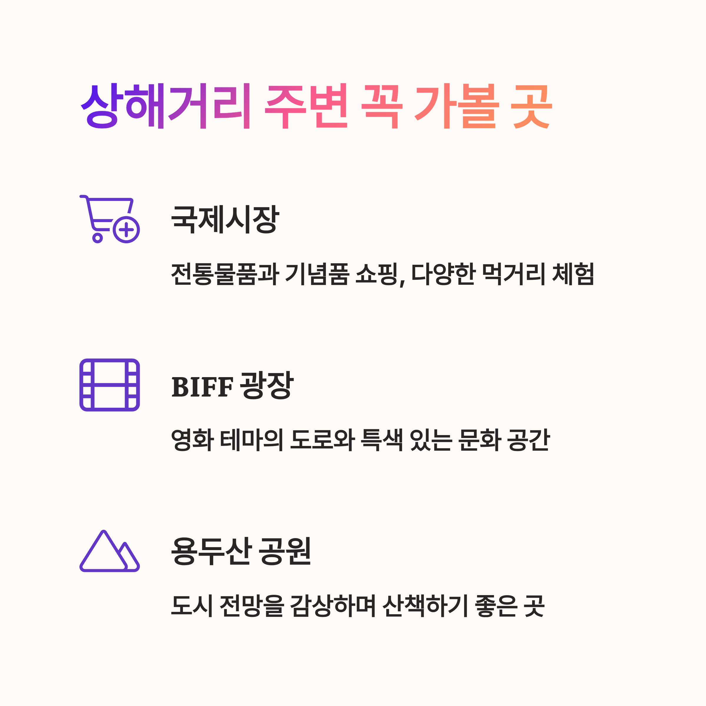 상해거리 주변으로는 부산국제시장과 BIFF 광장 등 대표 코스들이 있어 동선이 편리합니다.