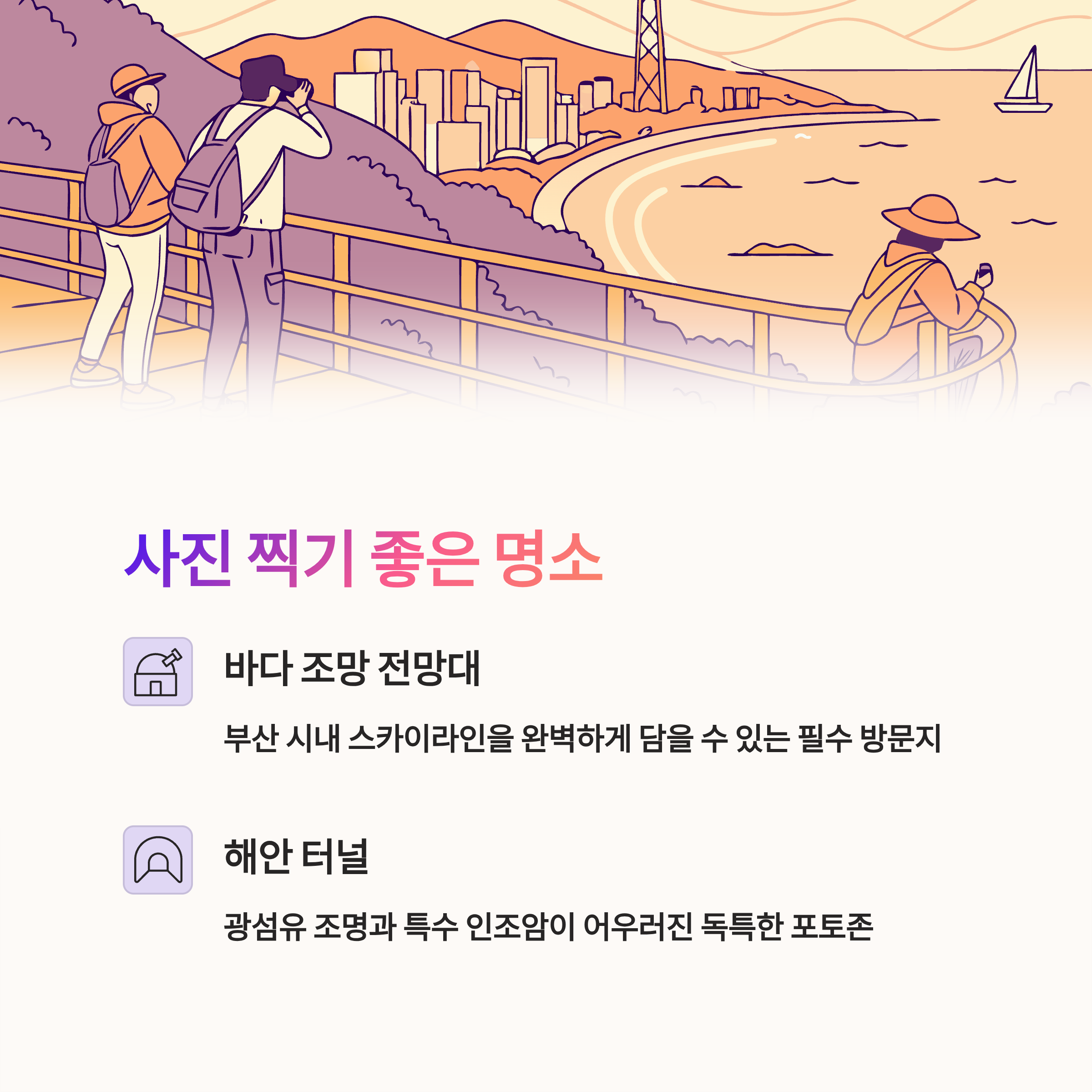 부산의 바다와 마을의 독특한 색감은 감성을 자극하며 언제나 힐링의 순간을 제공합니다.