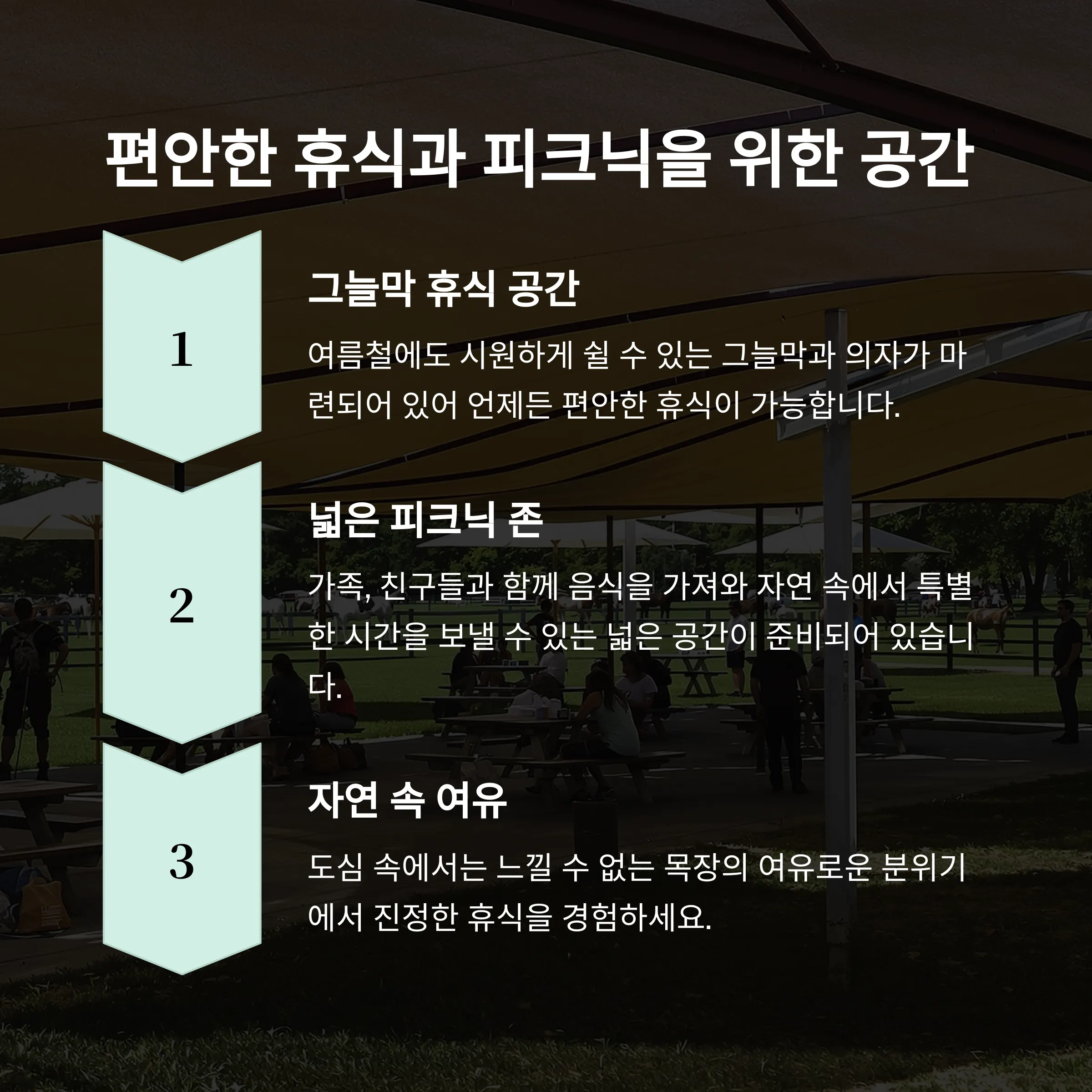 또한, 넓은 초원에는 주말 나들이를 계획하기에 이상적인 피크닉존도 마련되어 있어 식사나 간단한 부모와 아이들의 야외 놀이를 위한 장소로 추천됩니다.